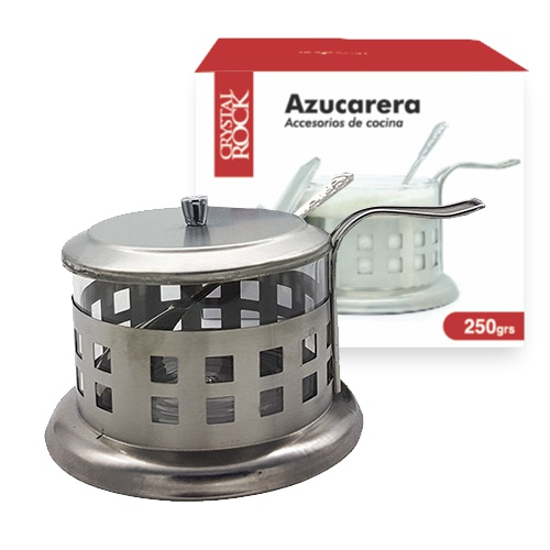 (Azucarera con base de acero. Cuenta con un diseño elegante que combina acero inoxidable y vidrio. Ideal para almacenar y servir azúcar en el café o té. Incluye cuchara).