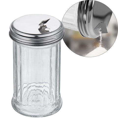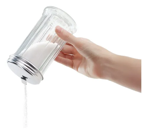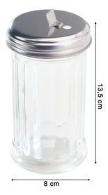 (Azucarera de vidrio con tapa de acero inoxidable y pico vertedor. Fabricada con vidrio resistente y tapa de acero inoxidable para mayor durabilidad y conservación del azúcar. Ideal para mantener el azúcar a mano en la cocina, en la mesa durante las comidas, o en cafeterías).