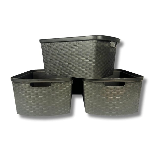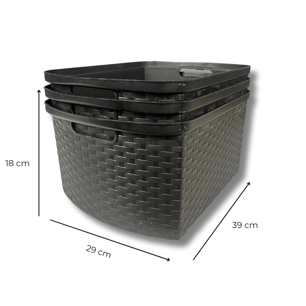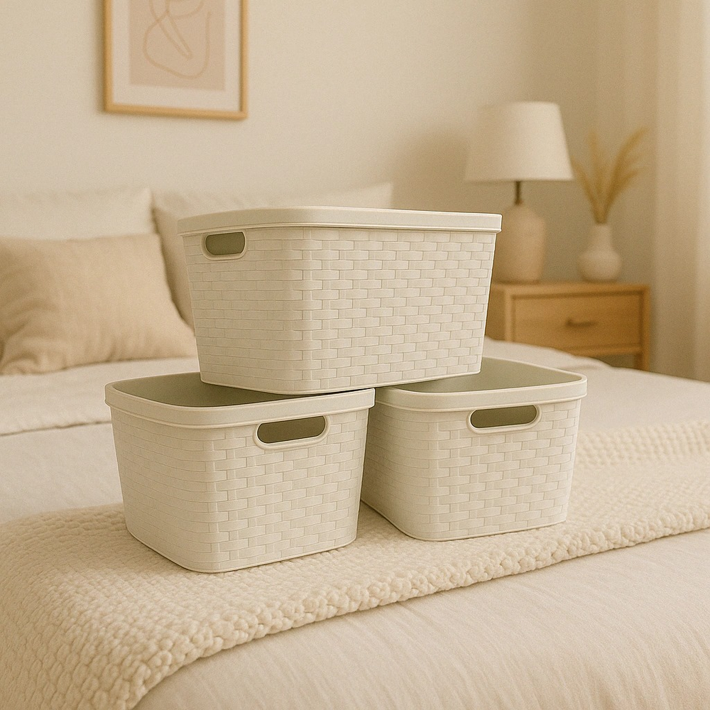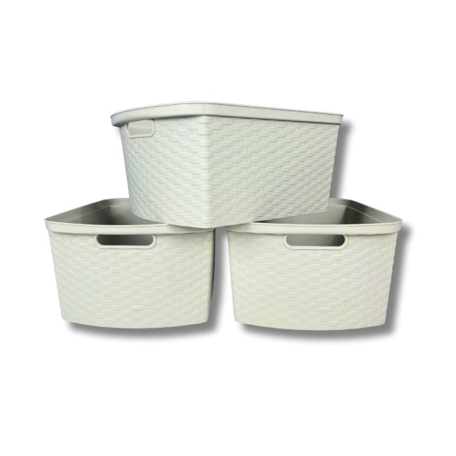(Canastos organizadores de plástico con asas laterales para facilitar su manejo. Su diseño imita el tejido de ratán, ofreciendo una estética natural. Son funcionales para organizar cualquier ambiente del hogar, como baños, vestidores o bibliotecas. Se venden por unidad, y son una opción práctica para almacenar objetos pequeños, ropa o juguetes. Están disponibles en diferentes colores para combinar con la decoración del hogar. Capacidad 15L).