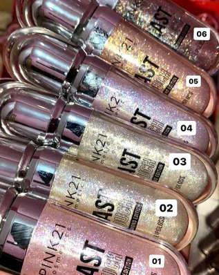 (Brillo labial Last Touch de "Pink 21". Cada caja trae 6 modelos diferentes de 7ML de capacidad, aprox. Ideal para dar un acabado brilloso a tu maquillaje).