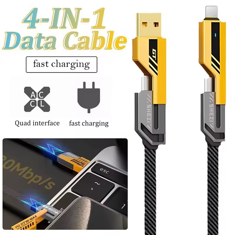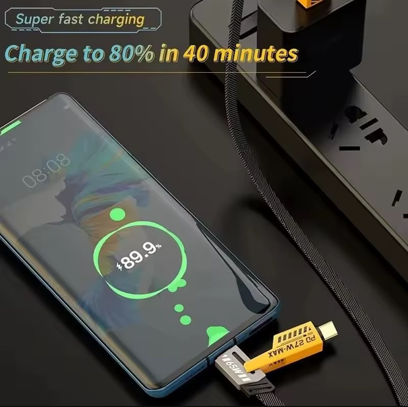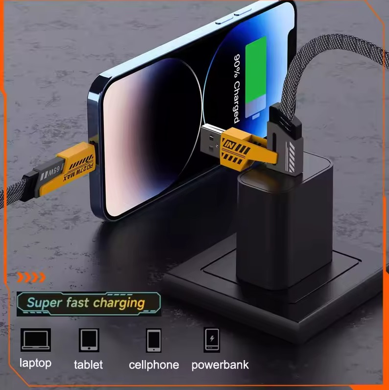 (Cable de carga rápida de 65W, diseñado para la carga veloz de dispositivos compatibles con iOS y Tipo-C. Su función principal es permitir una carga más rápida de dispositivos electrónicos en comparación con los cables de carga estándar. Esto se logra al permitir un mayor flujo de corriente eléctrica (hasta 65W en este caso) del cargador al dispositivo. Está diseñado para ser compatible con dispositivos que soporten carga rápida, incluyendo aquellos con puertos iOS (como iPhones/iPads con iOS 15 o superior) y puertos Type-C (comúnmente encontrados en teléfonos Android, laptops, etc.). Reduce el tiempo necesario para recargar la batería de los dispositivos, lo que lo hace conveniente para usuarios que necesitan cargar sus aparatos rápidamente).