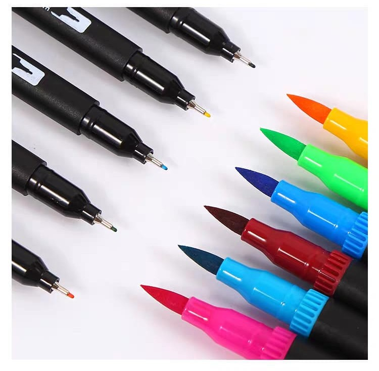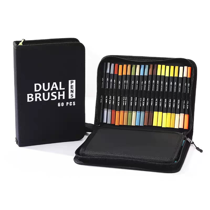 (Marcadores Dual Brush x 60 piezas. Contienen marcadores con doble punta, una es microfibra la otra es punta pincel ideal para lettering; Incluye estuche organizador, ligero y liviano y una amplia gama de colores que no se repiten).