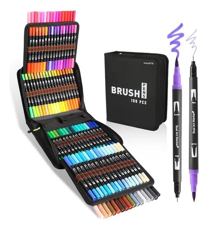 (Marcadores Dual Brush x 100 piezas. Contienen marcadores con doble punta, una es microfibra la otra es punta pincel indeleble ; Incluye estuche organizador práctico, ligero y liviano y una amplia gama de colores que no se repiten).