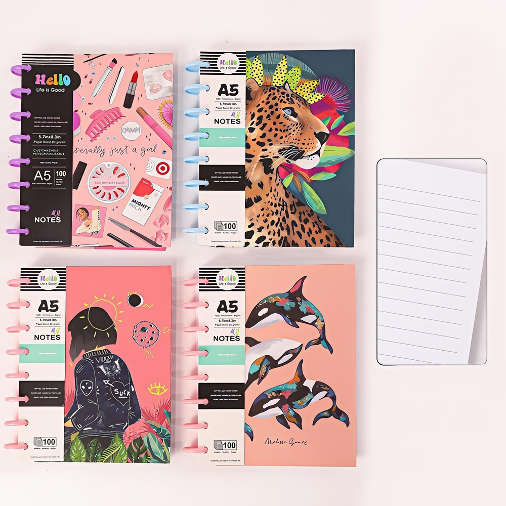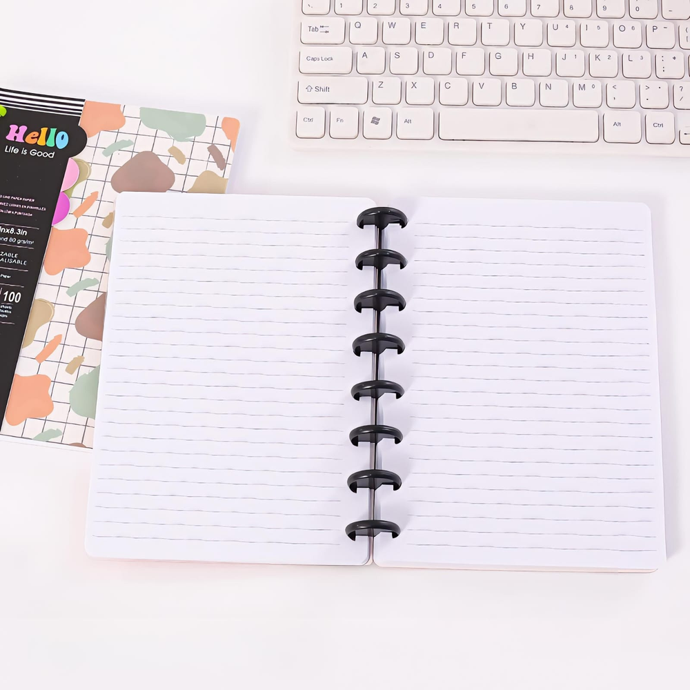 ( Son cuadernos que funcionan con un sistema de discos en vez de un anillado, con hojas que se pueden sacar y volver a poner cuando quieras. Son tapa dura, Permiten registrar ideas, pensamientos, recordatorios, citas y listas de tareas. Ayudan a organizar información, priorizar tareas y llevar un seguimiento de horarios o actividades. Son útiles para estudiantes, profesionales o cualquier persona que necesite escribir y organizar su información. Disponibles en varios diseños). Tapa Dura (ut26).