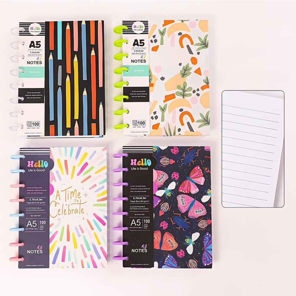 ( Son cuadernos que funcionan con un sistema de discos en vez de un anillado, con hojas que se pueden sacar y volver a poner cuando quieras. Son tapa dura, Permiten registrar ideas, pensamientos, recordatorios, citas y listas de tareas. Ayudan a organizar información, priorizar tareas y llevar un seguimiento de horarios o actividades. Son útiles para estudiantes, profesionales o cualquier persona que necesite escribir y organizar su información. Disponibles en varios diseños).