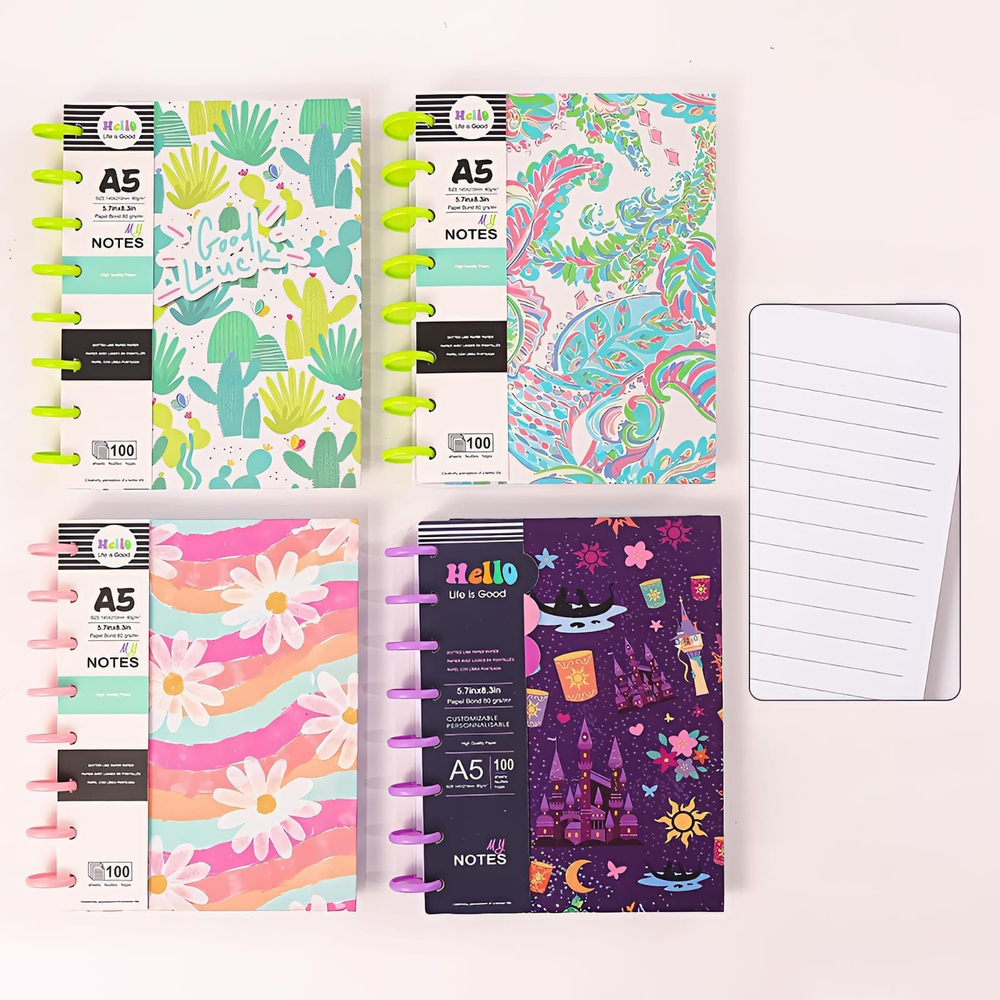 ( Son cuadernos que funcionan con un sistema de discos en vez de un anillado, con hojas que se pueden sacar y volver a poner cuando quieras. Son tapa dura, Permiten registrar ideas, pensamientos, recordatorios, citas y listas de tareas. Ayudan a organizar información, priorizar tareas y llevar un seguimiento de horarios o actividades. Son útiles para estudiantes, profesionales o cualquier persona que necesite escribir y organizar su información. Disponibles en varios diseños).