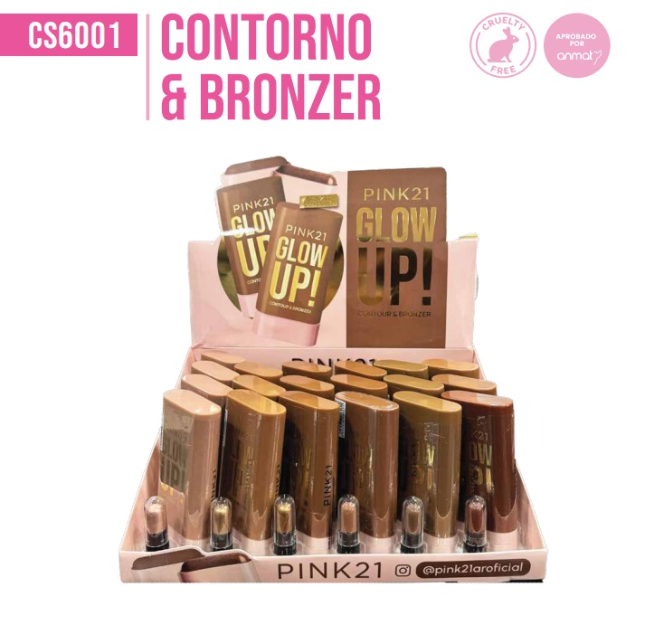 (Caja x 24U. Cuenta con 3 tonos de iluminador y 3 de contorno marca "Pink 21". Proporciona un acabado radiante y fresco a la piel).