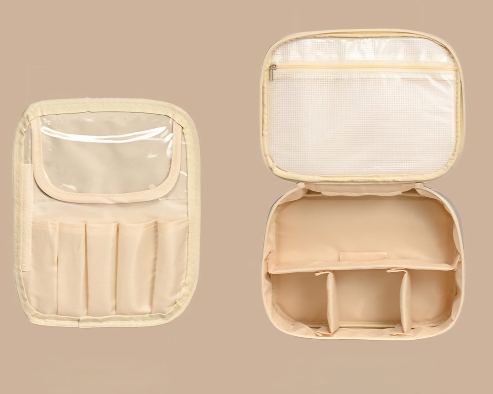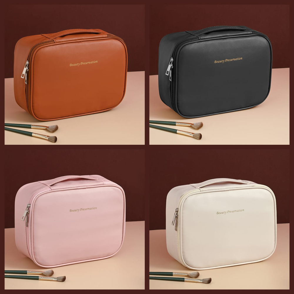 (Neceser que permite guardar y organizar de manera eficiente productos de maquillaje, como labiales, brochas, paletas de sombras, cremas y otros artículos personales. Facilita el transporte de cosméticos de forma segura, evitando pérdidas o daños durante viajes o traslados, ya que muchos cuentan con compartimentos internos y materiales duraderos. Mantiene los productos de belleza ordenados y fácilmente accesibles, lo que agiliza la rutina de maquillaje Son multifuncionales y pueden usarse también para guardar joyas, accesorios electrónicos o artículos de tocador).
