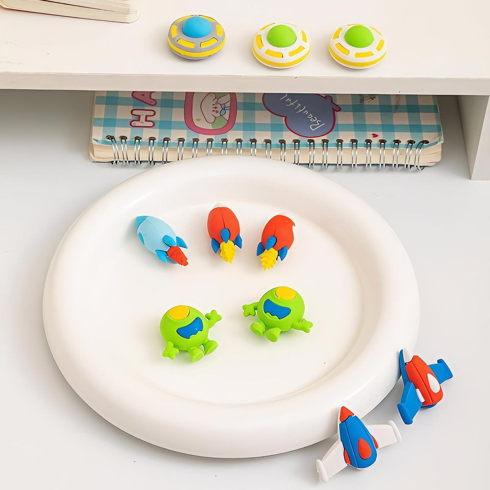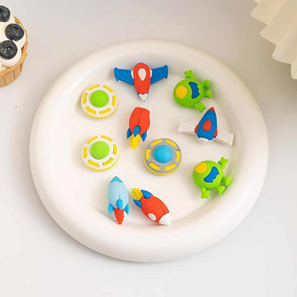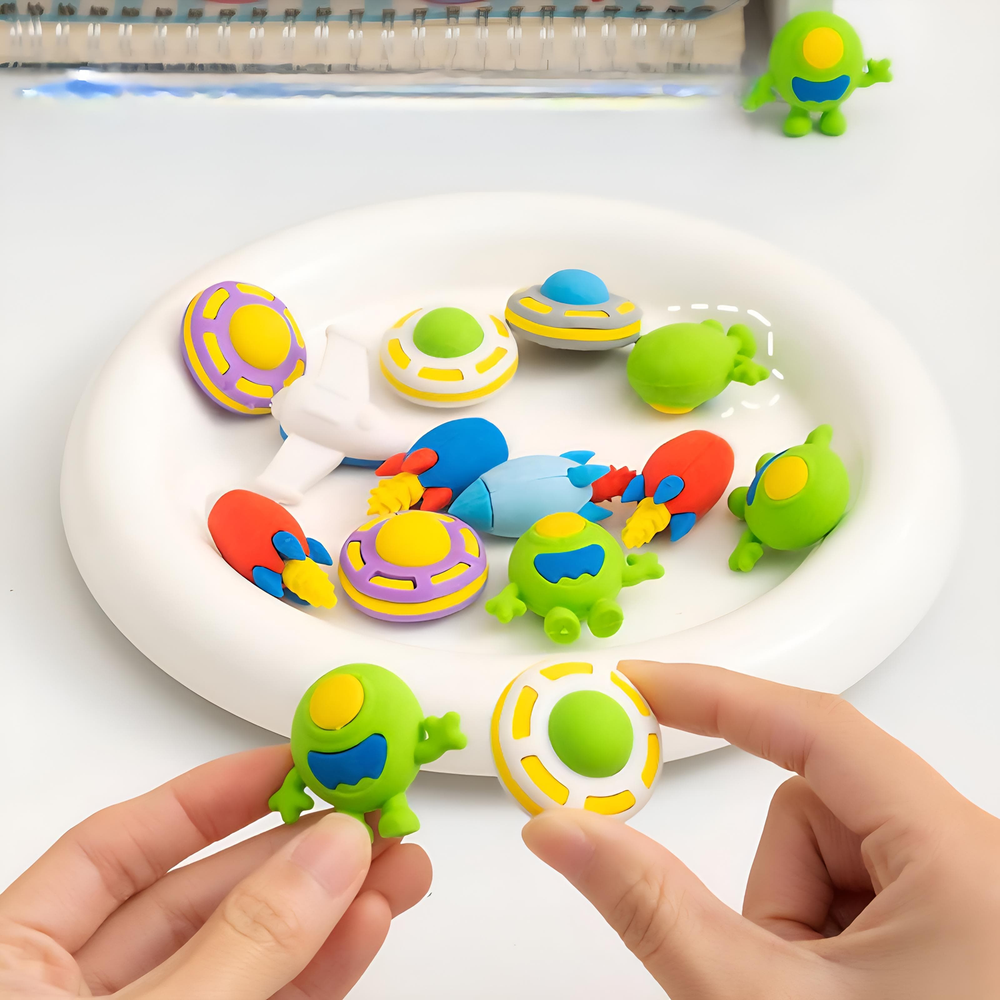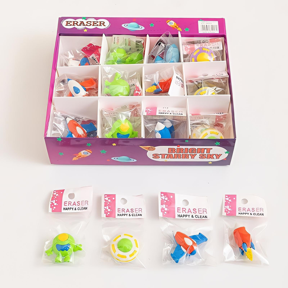 (Goma para borrar con diseño en forma de naves espaciales, ovnis, astronautas y extraterrestres. Vienen en caja x 36 unidades).