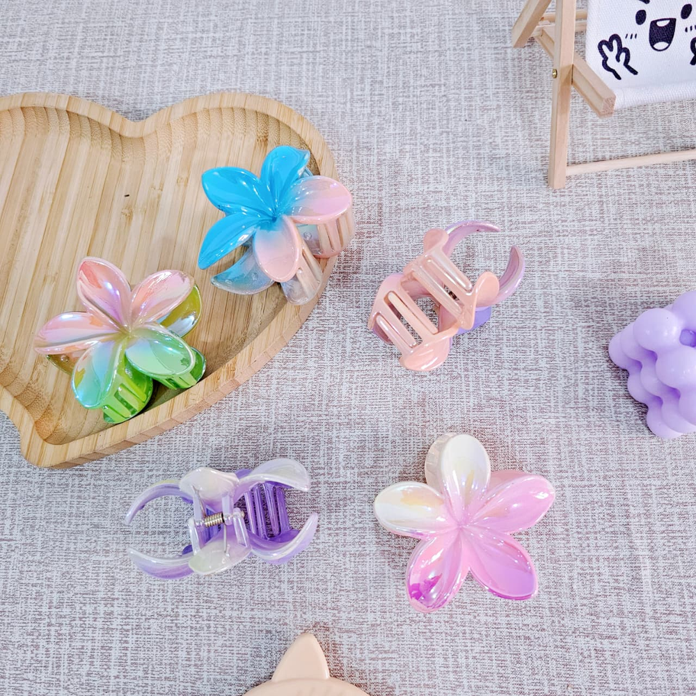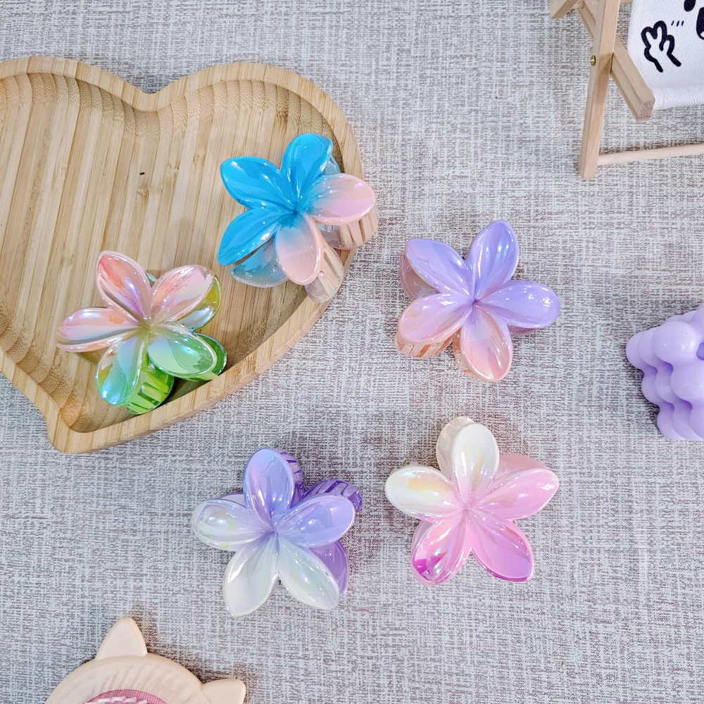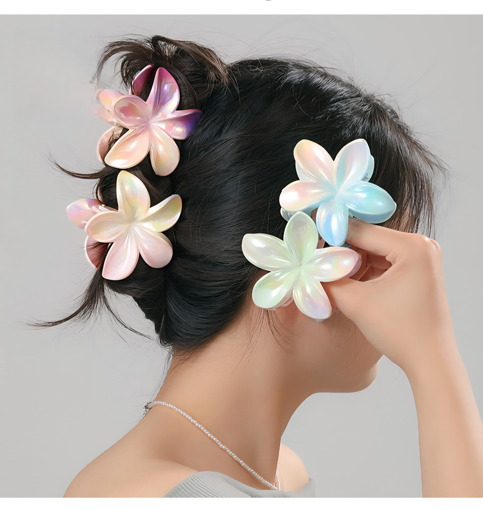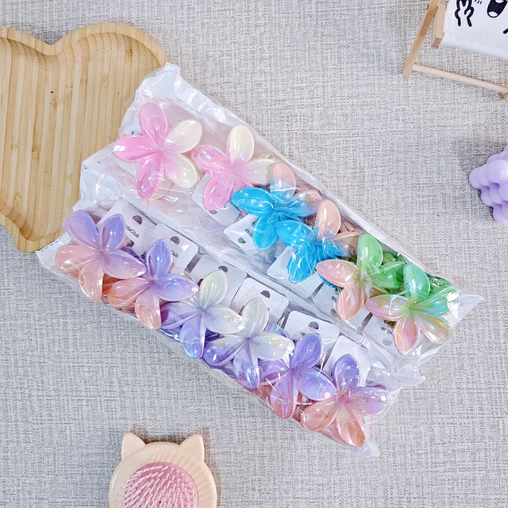 (Broches para el cabello en forma de flor hawaiana. Están disponibles por pack de 12U. en varios colores tornasolados, incluyendo naranja, rosa, violeta, celeste, etc. Son un accesorio de moda popular para el cabello).