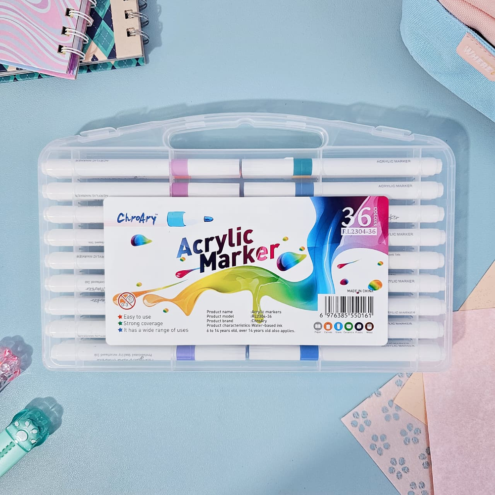 (Set x 36U. tinta acrílica ideal para pintar en vidrio, pared o superficie oscuras como cartulina, etc. Punta tipo pincel ideal para pintar o hacer lettering).