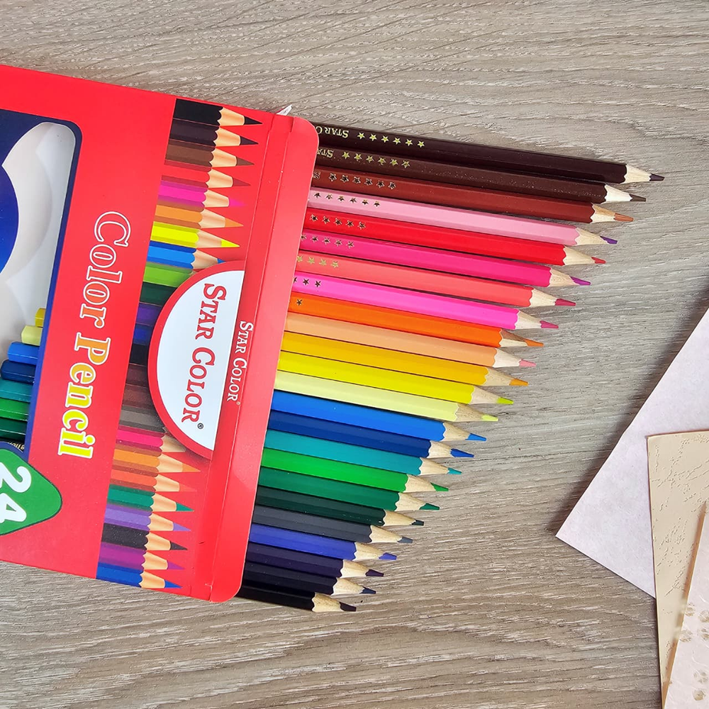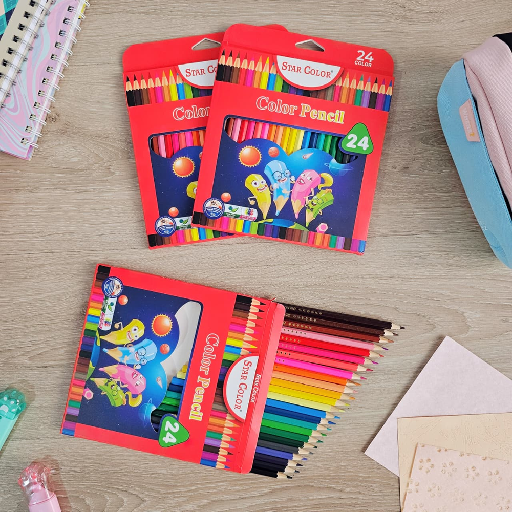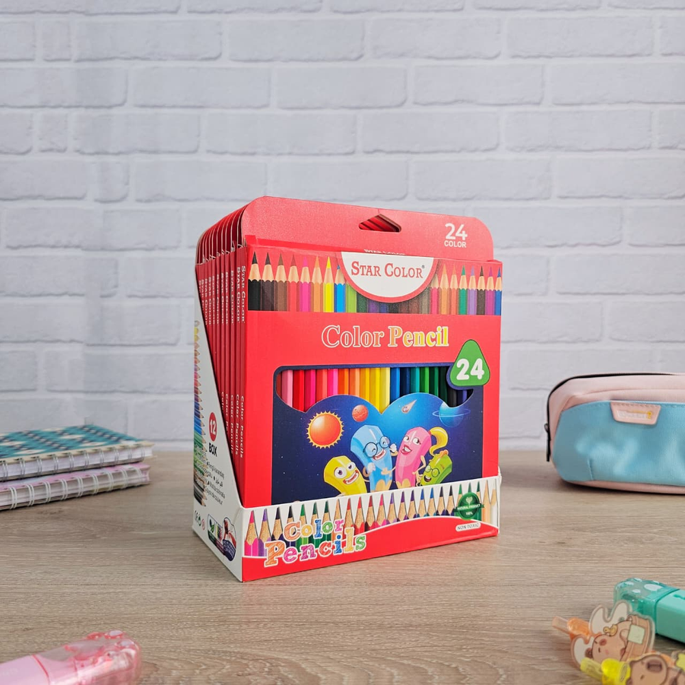 (Caja con 24 unidades de lápices colores surtidos, mina resistente y suave. Ideal para darle color a tus dibujos).