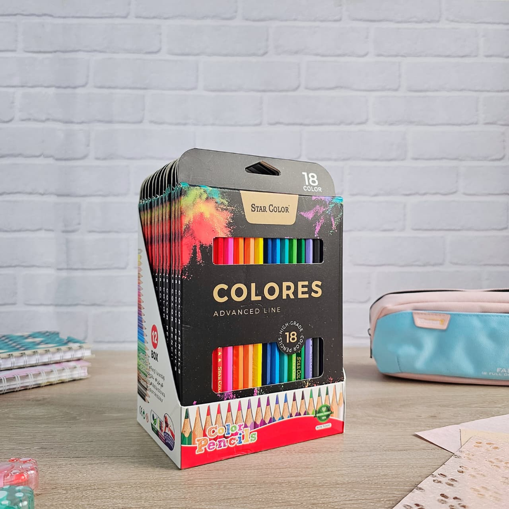 (Caja con 18 unidades de lápices colores surtidos, mina resistente y suave. Ideal para darle color a tus dibujos).