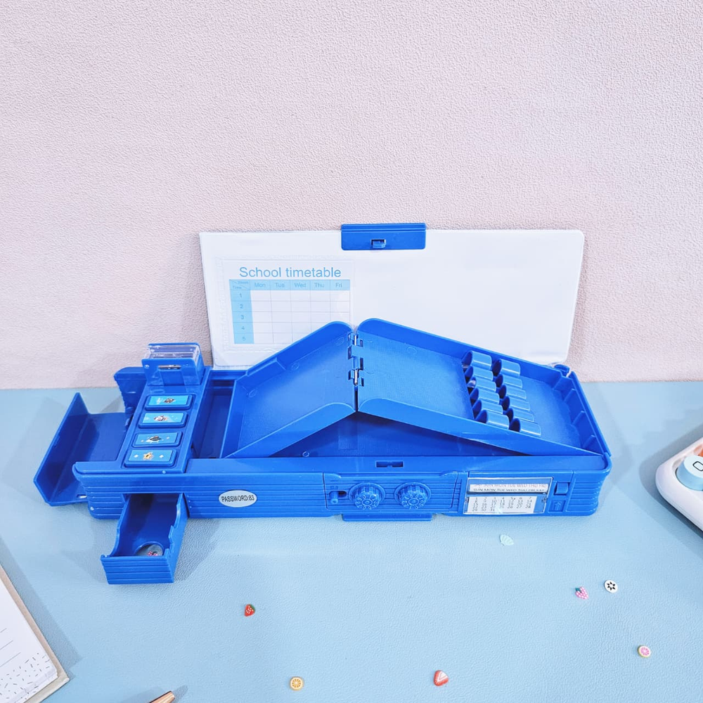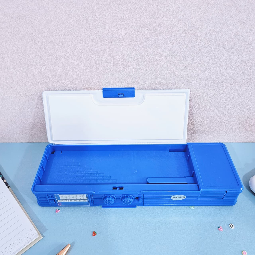 (Cartuchera ideal para guardar y organizar lapiceras, lápices, gomas de borrar, sacapuntas, tijeras, pegamento y otros pequeños accesorios. Tiene contraseña para poder abrirla, incluye sacapuntas y cuenta con compartimientos varios que pueden abrirse con presionar un botón. Tiene 2 sectores para colocar lápices, regla y objetos mas grandes y 3 mas chicos). (Ut28)