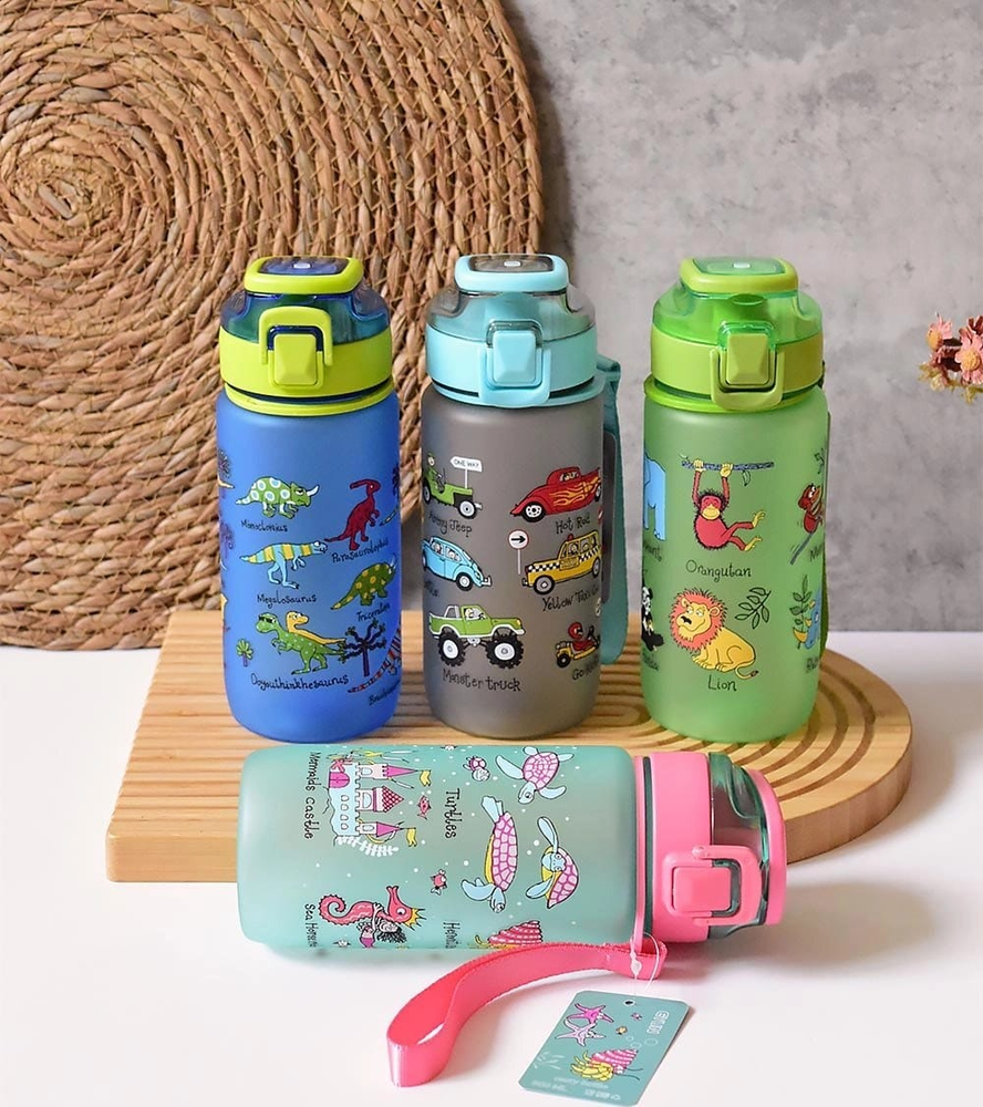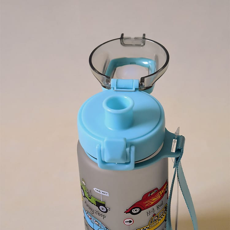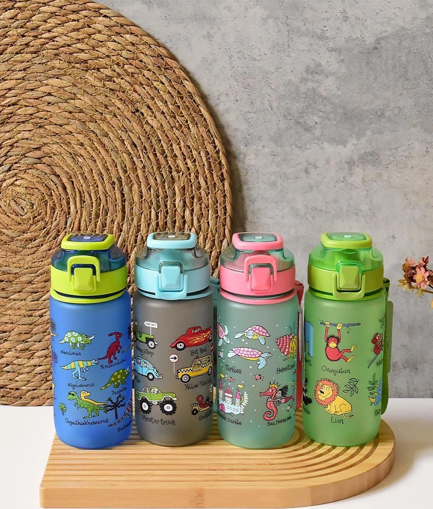 (Botella de agua infantil con correa para transportar, tapa a rosca y pico, disponible en cuatro colores y diseños diferentes).