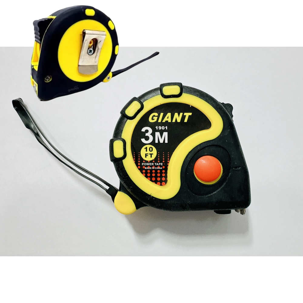 (Cinta métrica de 3M, superficie de goma y cinta de acero; posee botón de traba y manija para un mejor transporte).