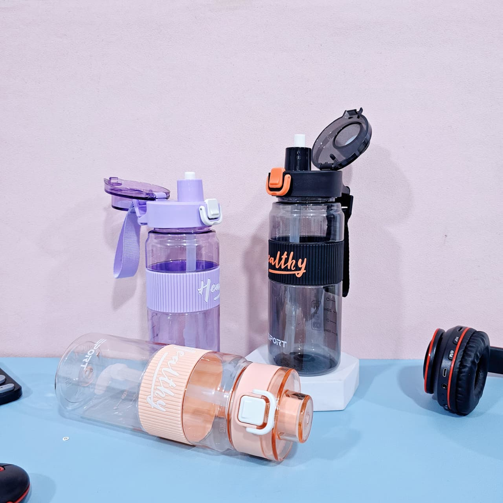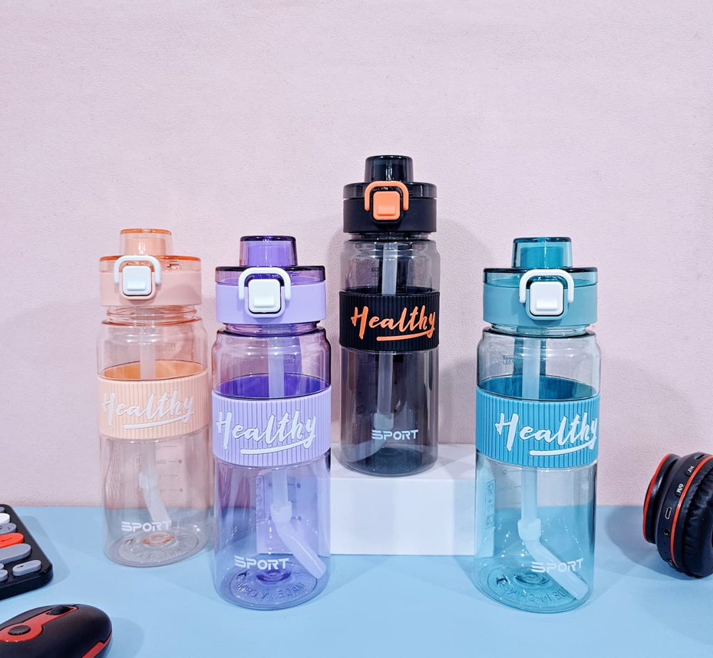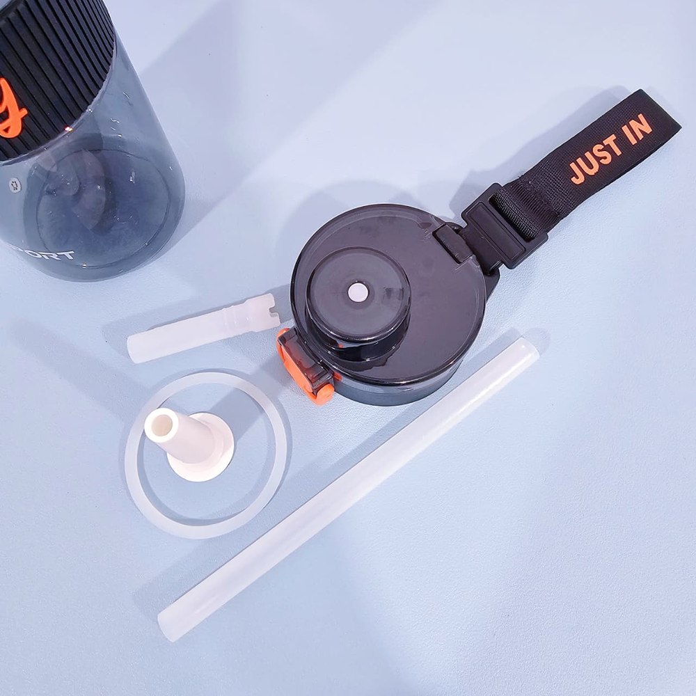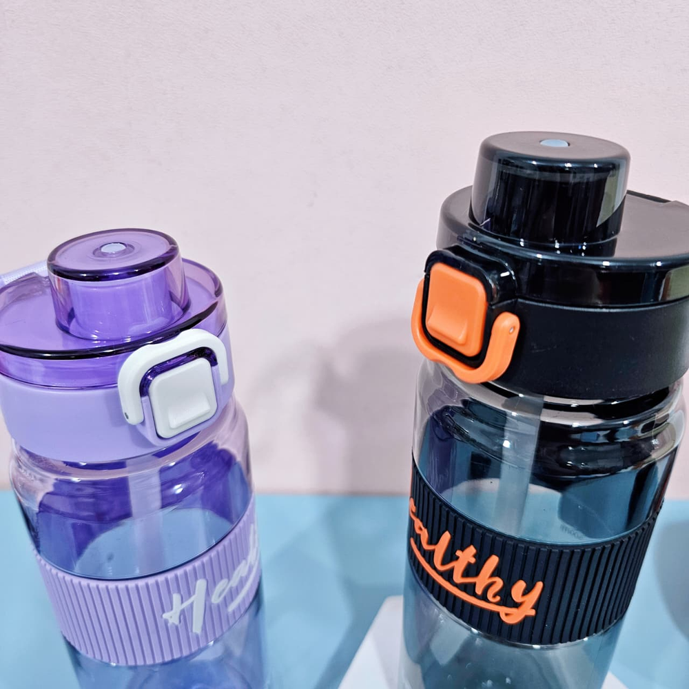 (Cuenta con un formato muy cómodo y funcional. La tapa se enrosca de forma segura , el pico tiene una tapa para mantenerlo limpio y se abre con solo presionar un botón, cuenta con un sorbete , correa y botón antivuelco. Ideal para uso habitual).