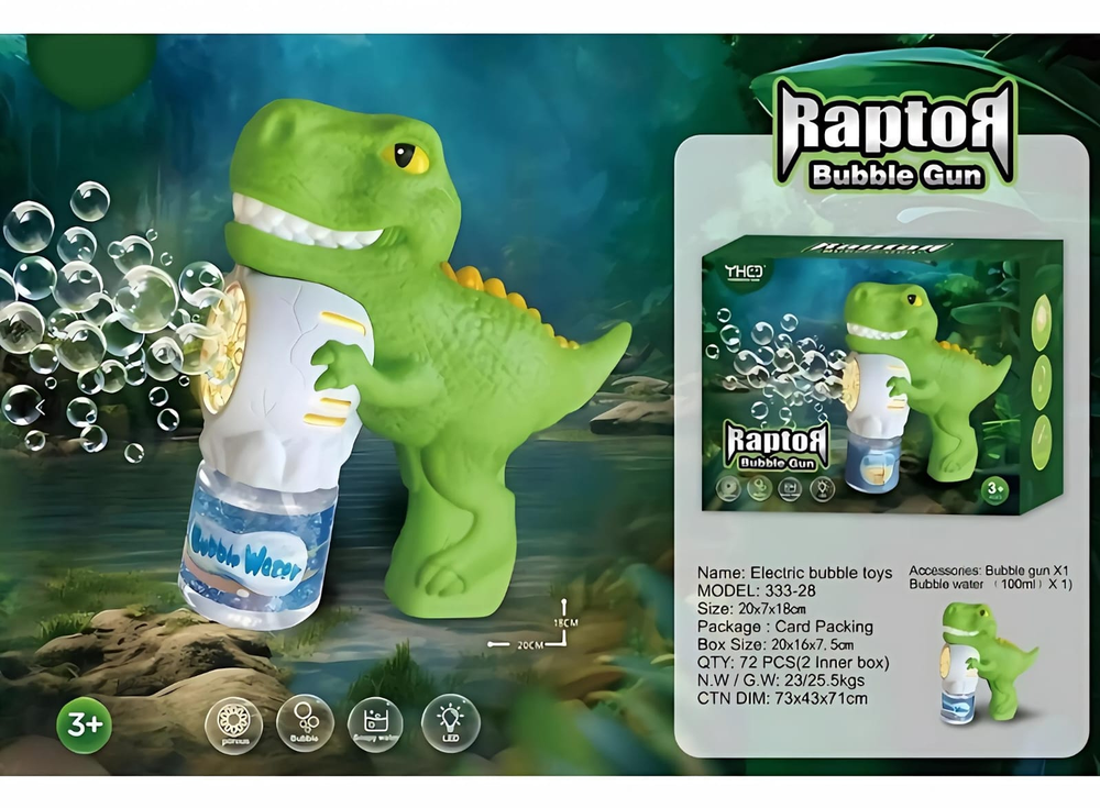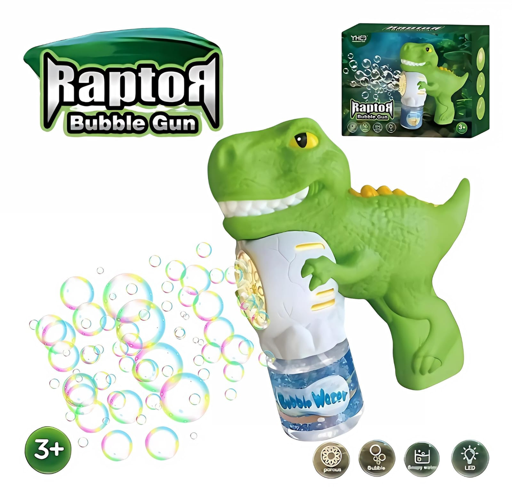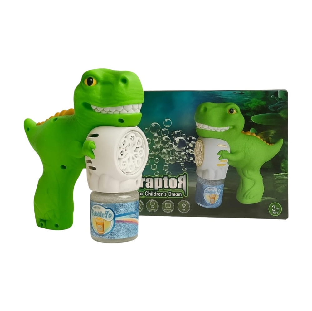 (Pistolas de burbujas automáticas con diseño de dinosaurio, que producen burbujas al presionar el gatillo. Incluyen luces LED para una experiencia de juego más inmersiva. Requieren 4 pilas AA (NO INCLUIDAS) y un recipiente para el líquido de burbujas).
