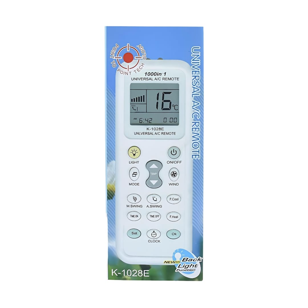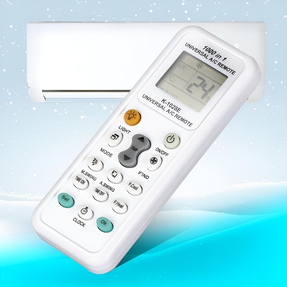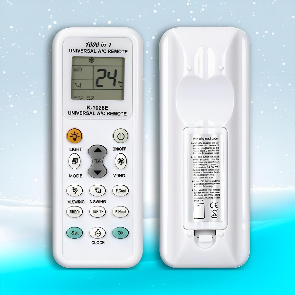 (Control Remoto Universal para Aire Acondicionado K-1028E. Es compatible con más de 1000 marcas de aire acondicionado, cuenta con una pantalla LCD para fácil configuración y operación, e incluye funciones como reloj, temporizador de encendido/apagado y luz de fondo. Requiere 2 pilas AAA (no incluidas).