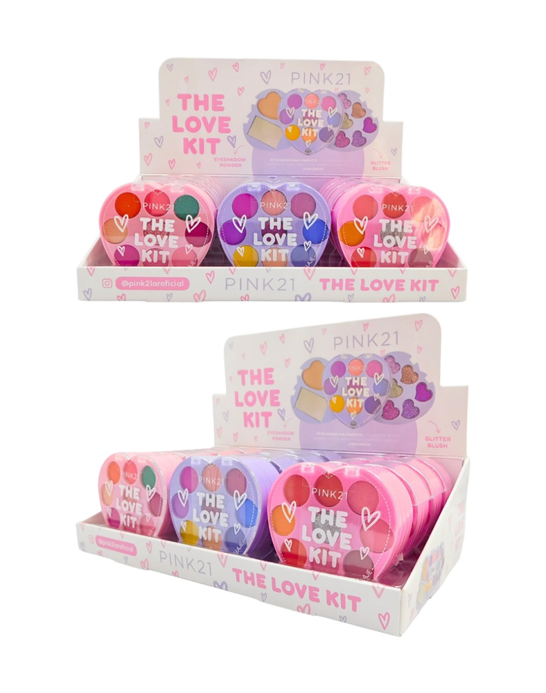 (Kit de maquillaje marca "Pink 21". Cuenta con espejo, rubor, sombra, polvo y glitter. Ideal para regalar y para niños. Se puede usar en todo el rostro).