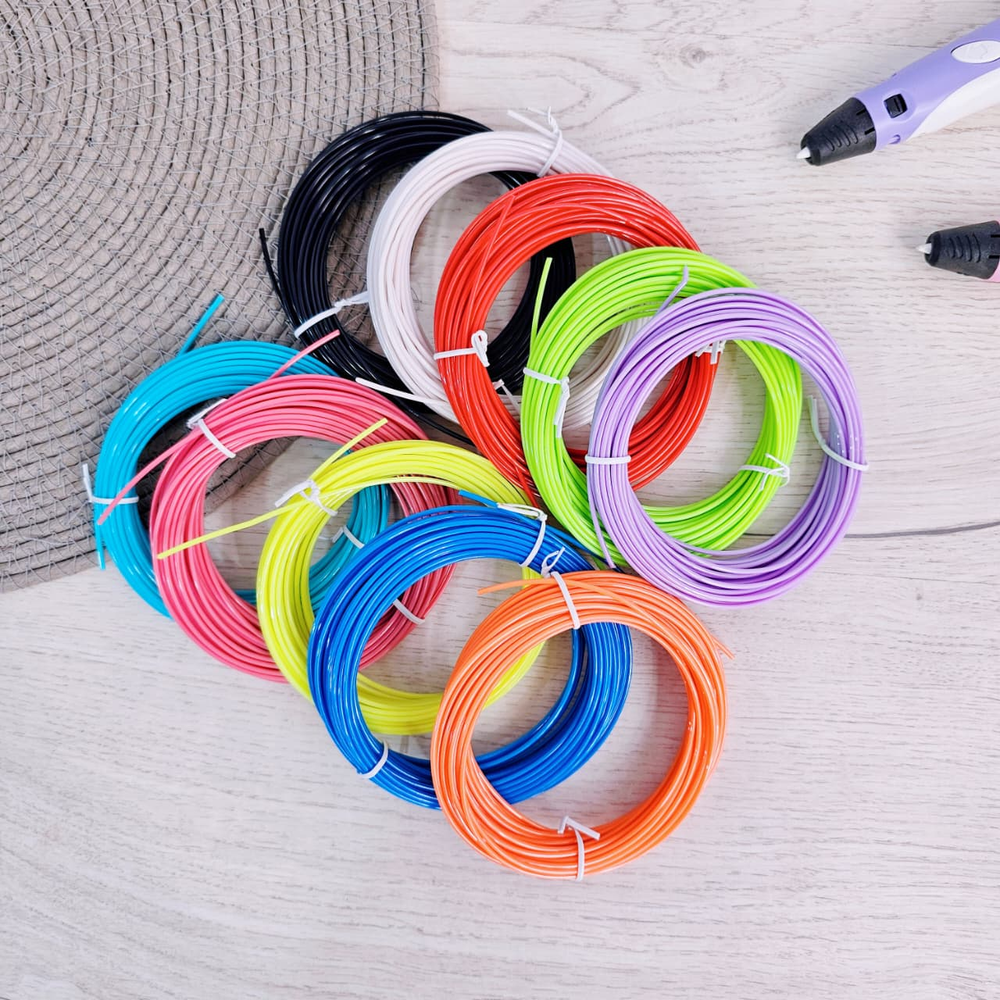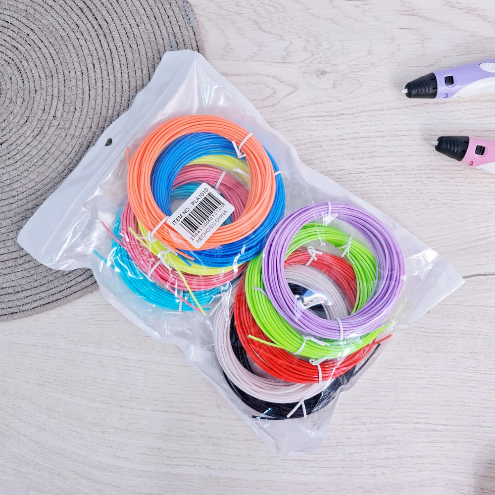 (Pack x 10U. Filamento Repuesto Lapiz 3D. Son el material de "tinta" que se derrite y se extruye desde un bolígrafo 3D para crear estructuras tridimensionales. Son compatibles con la mayoría de los bolígrafos 3D. Vienen en una amplia gama de colores, como se ve en la imagen, lo que permite una mayor creatividad en los diseños).