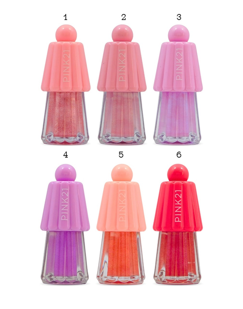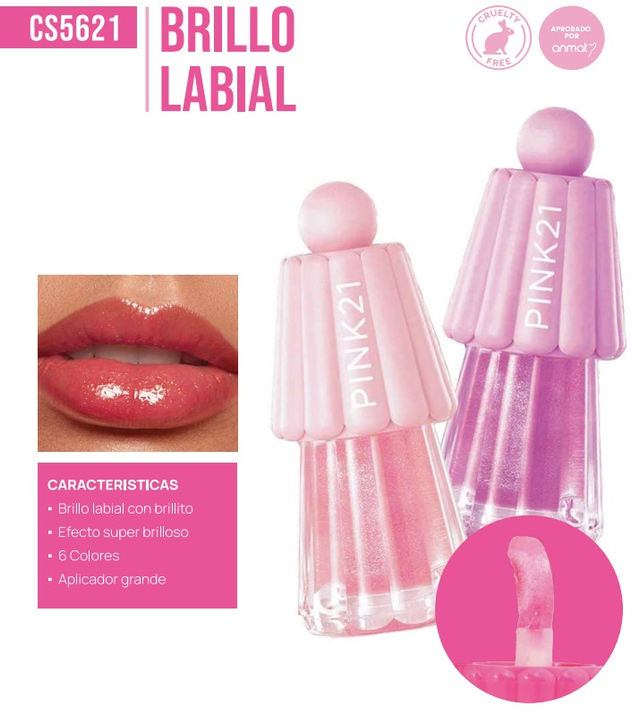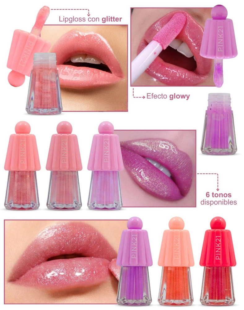 (Brillo Labial super hidratante "Pink 21". Aporta brillo radiante y sutil a los labios, además de hidratarlos y nutrirlos. Efecto super brilloso, viene en 6 colores distintos y cuenta con un aplicador grande).