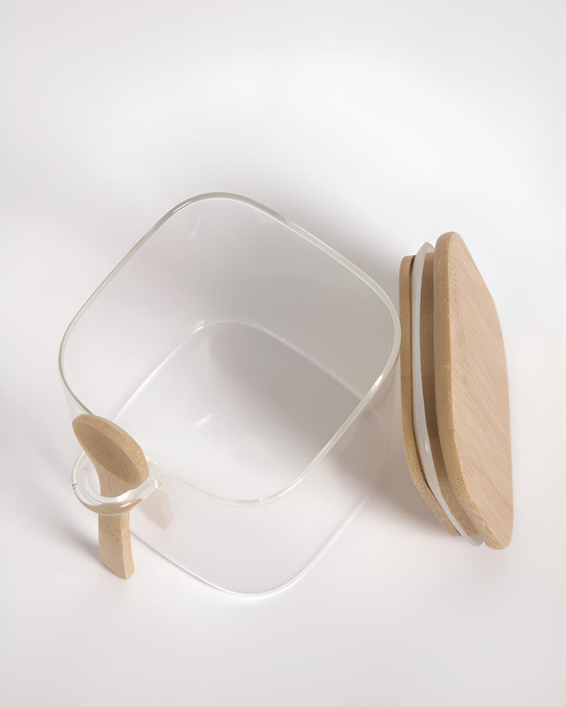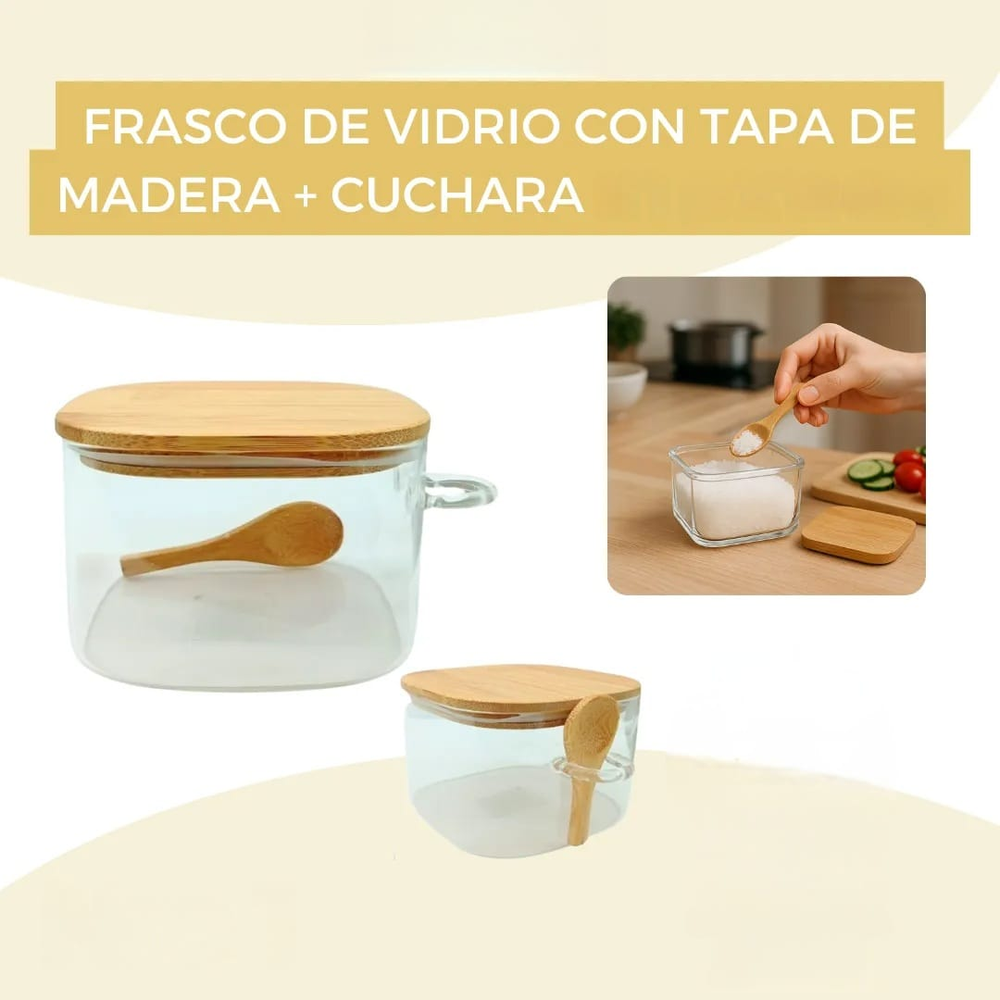 (Frasco de Vidrio cuadrado con cucharita de bambú, tapa hermética).
