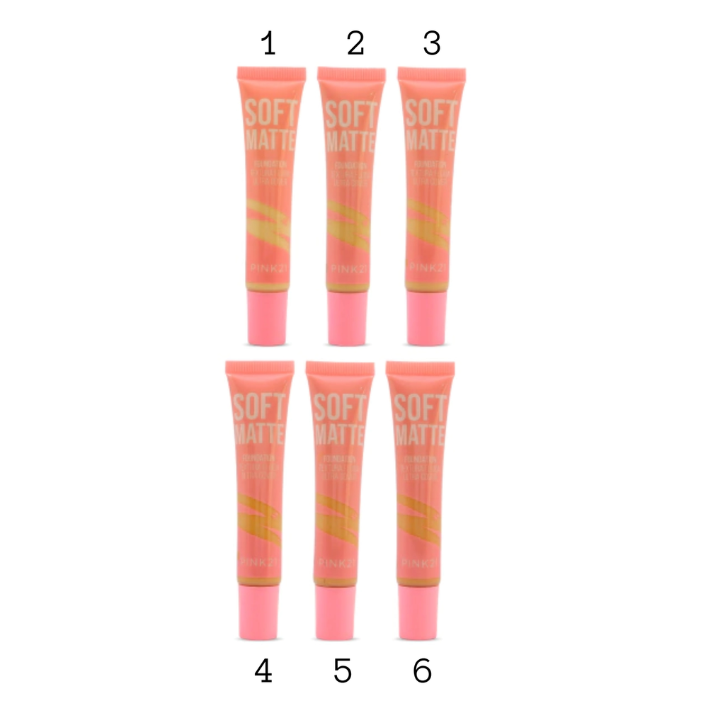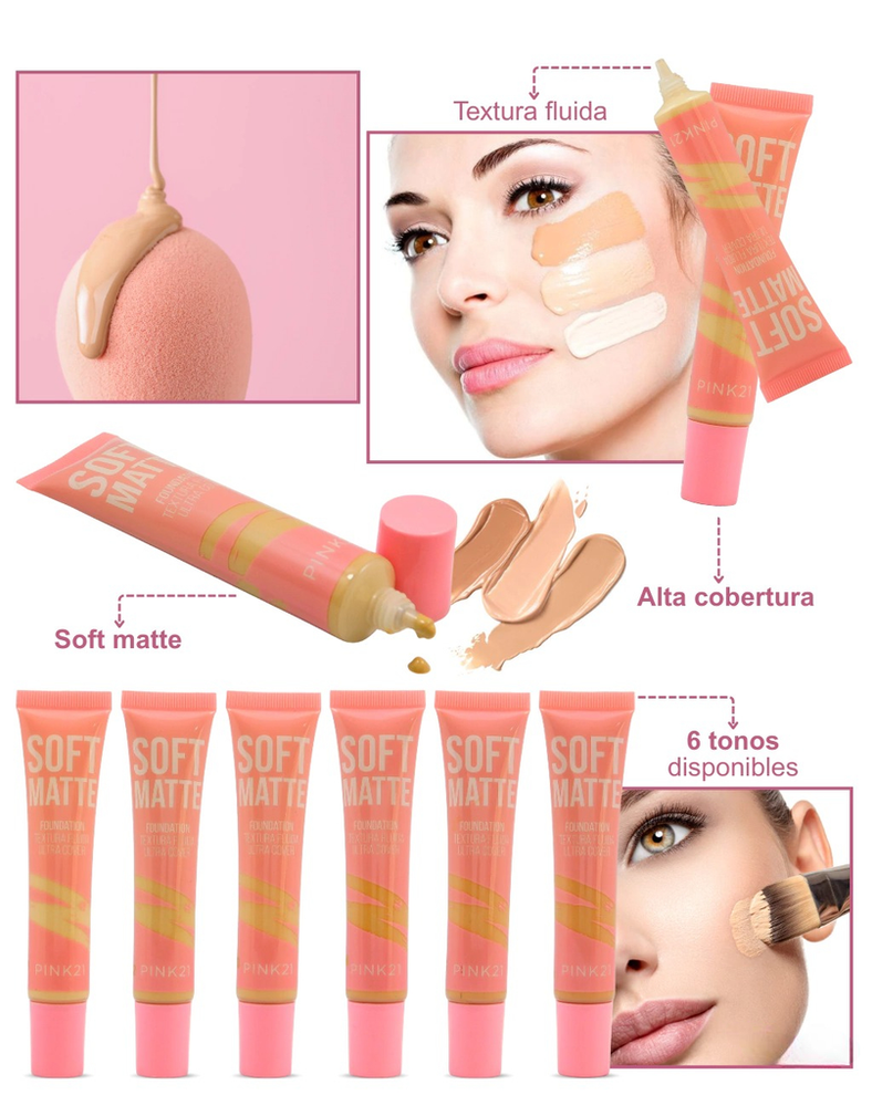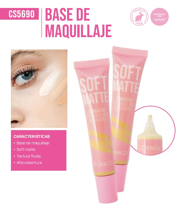 (Base de Maquillaje "Pink 21" con acabado mate suave y textura fluida que ofrece alta cobertura. 6Tonos diferentes a elección).