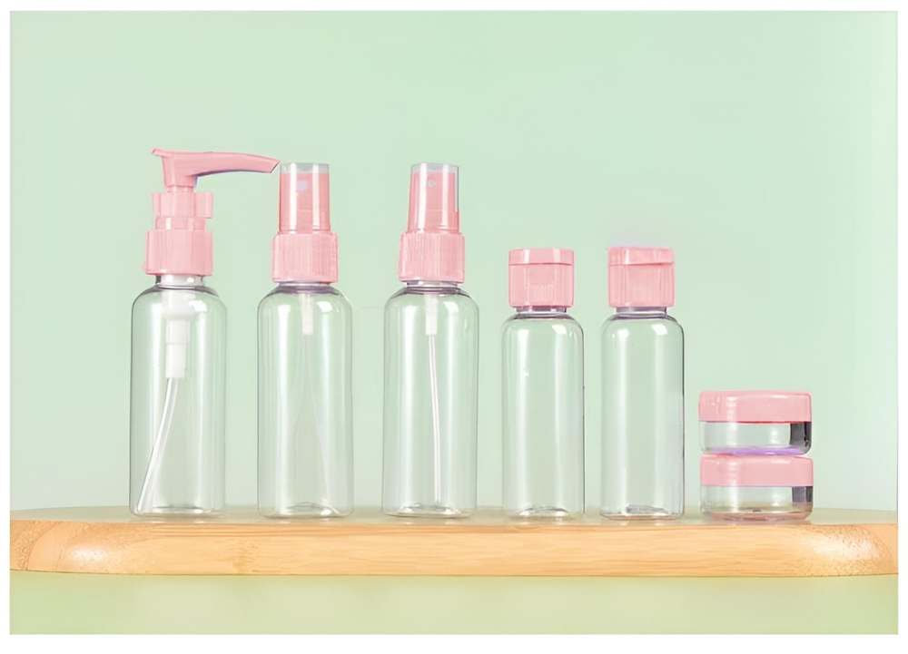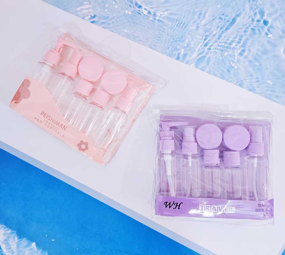 (Set x 7U. Neceser de viaje, que cuenta con 1 dispensador, 1 rociador, 2 frascos y 2 potes para crema, ideal para poder sacar el producto fácilmente presionándolo. Son super útiles a la hora de llevarlos de viaje, ya que por su tamaño no ocupan espacio). Ut29.