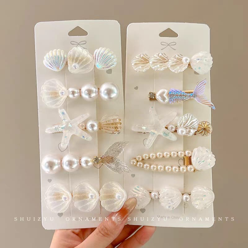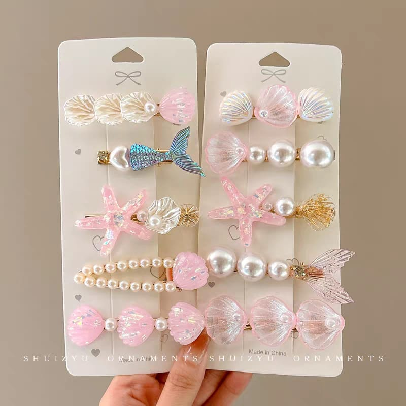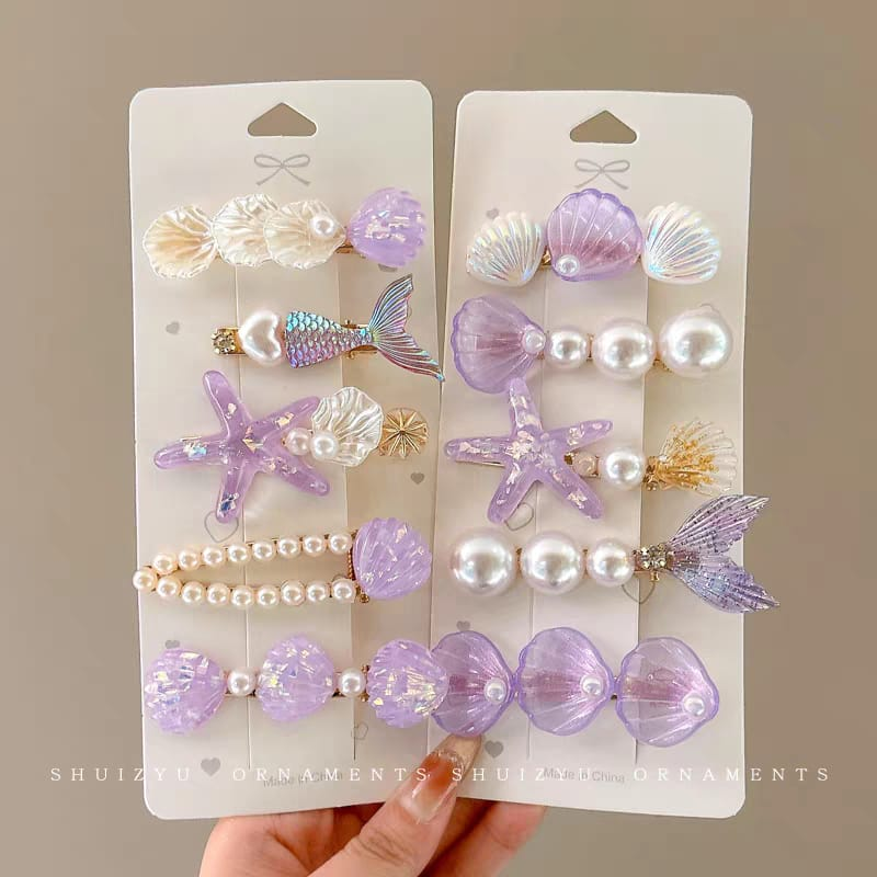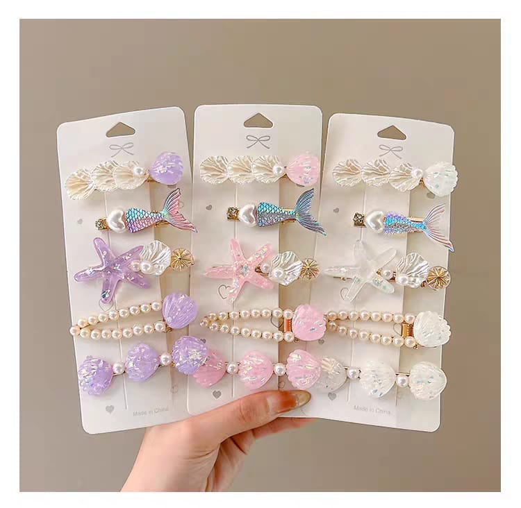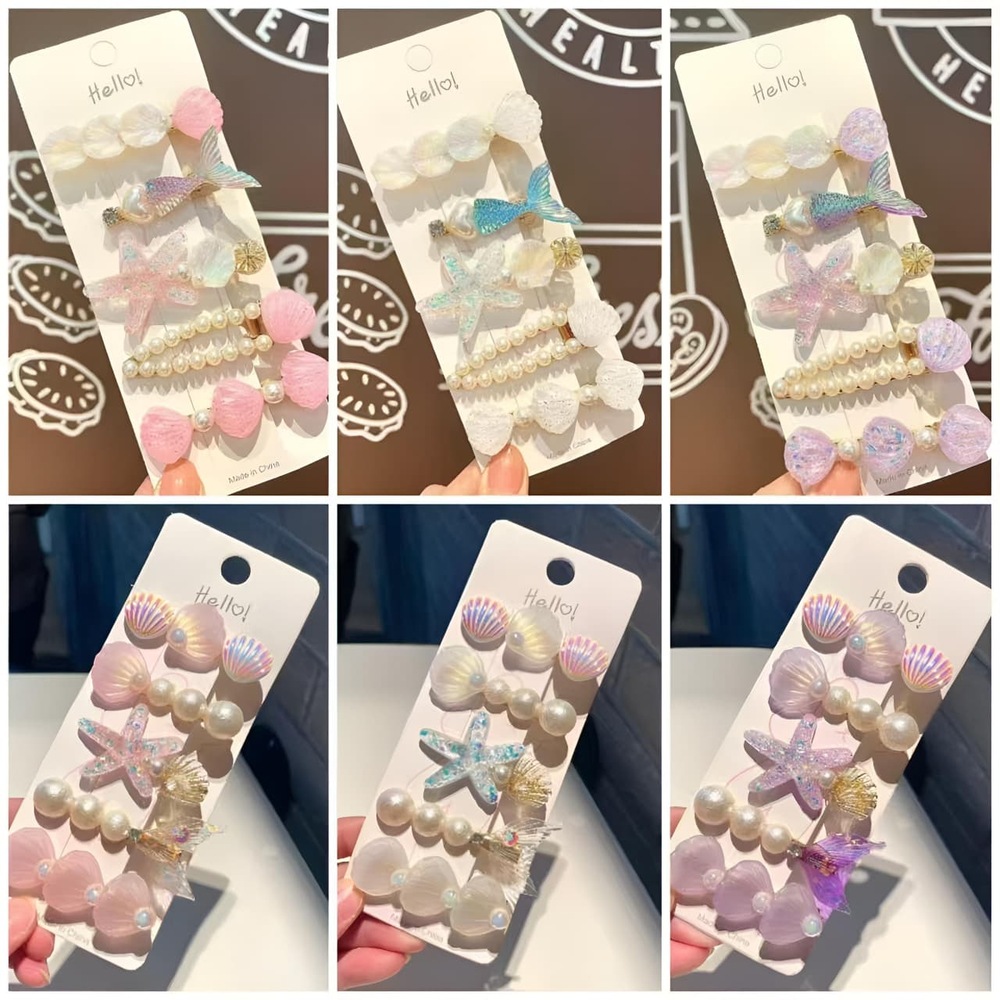 (Hebillas disponibles con diseño de sirena, caracoles y estrellas de mar que sirven para sujetar el cabello, ya sea para mantenerlo alejado de la cara, para crear peinados o simplemente como elemento decorativo)