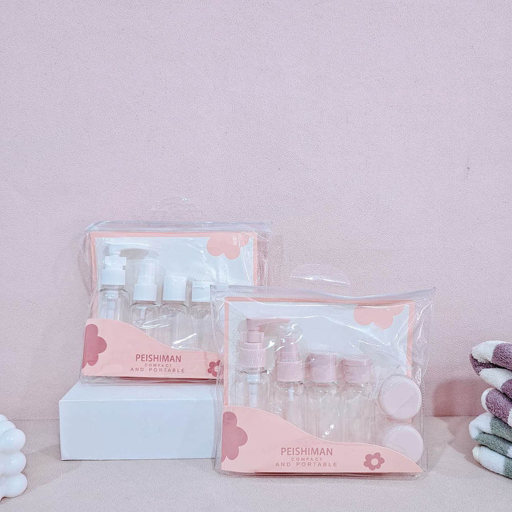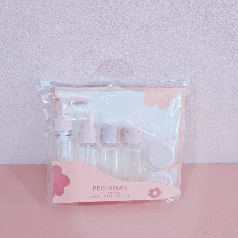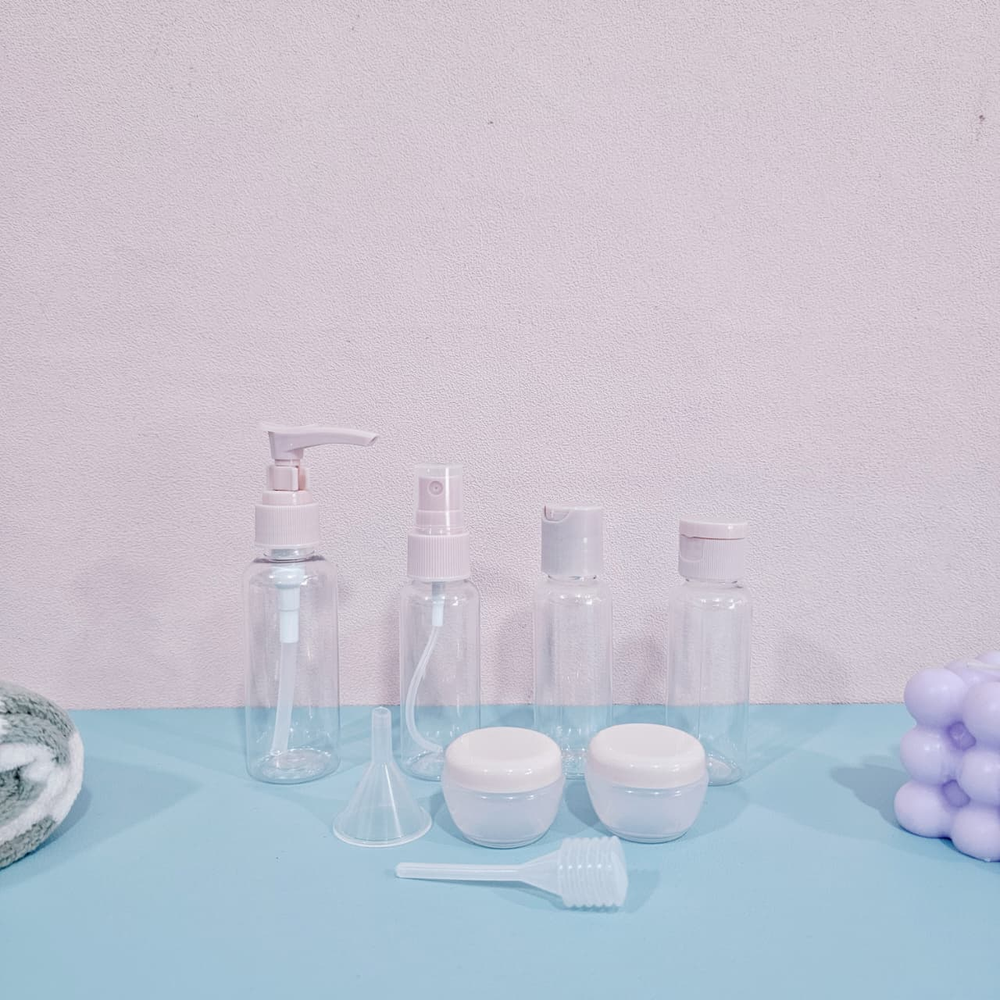 (Cada set cuenta con un dispensador, , 1 rociador, 2 frascos y 2 potes para cremas. Vienen en una bolsita con cierre hermético . Permite llevar tus productos favoritos como champú, acondicionador, cremas, lociones o perfumes en envases pequeños y ligeros, ideales para ahorrar espacio y peso en tu equipaje).