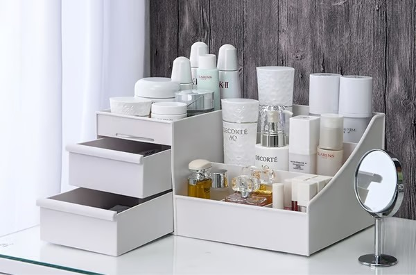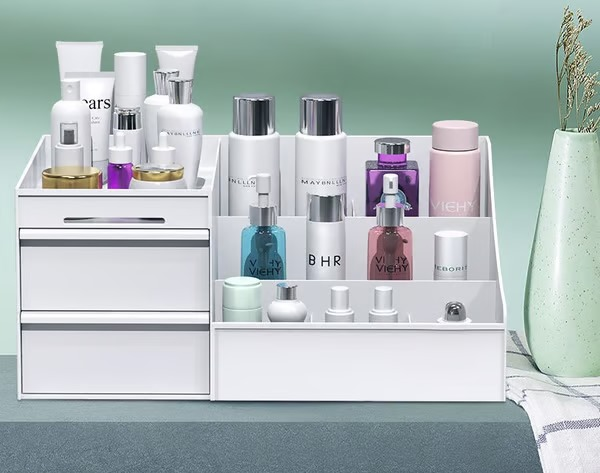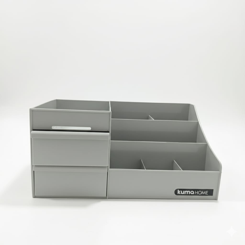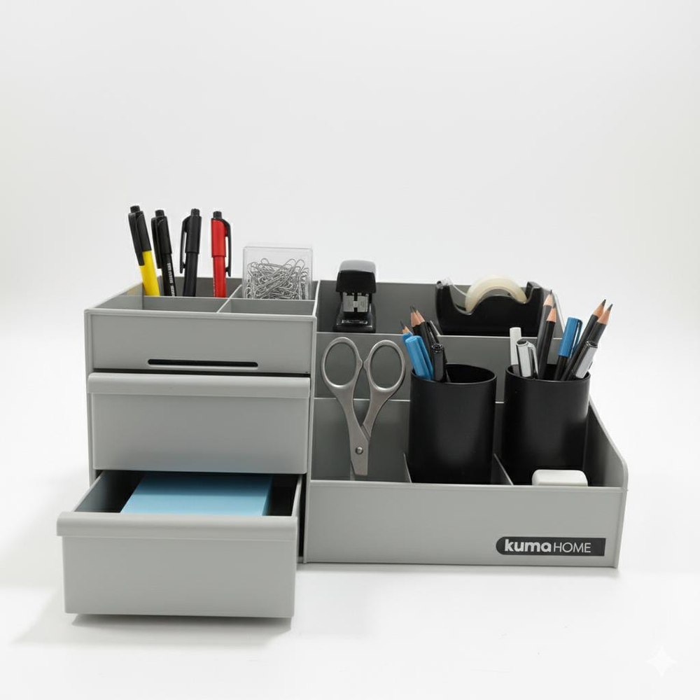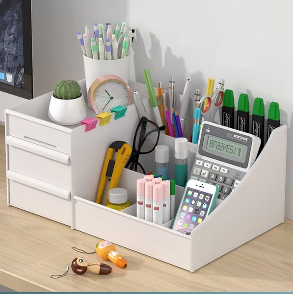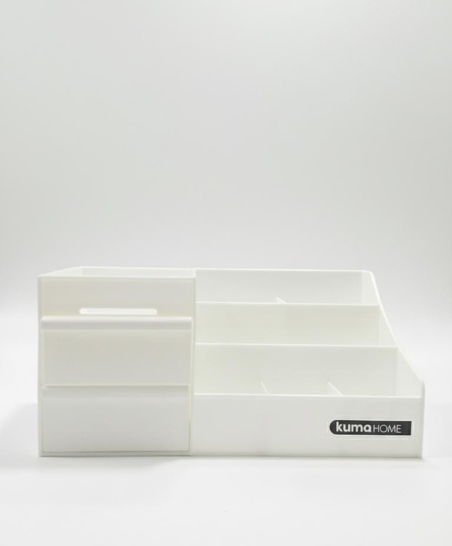 (Organizador de escritorio disponible en color blanco. Cuenta con 6 orificios para guardar lápices y útiles escolares como también artículos de belleza. El diseño lo hace practico y funcional, tiene 2 cajones donde tambien podes guardar tus objetos personales).