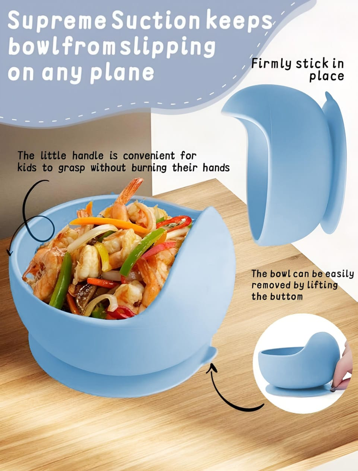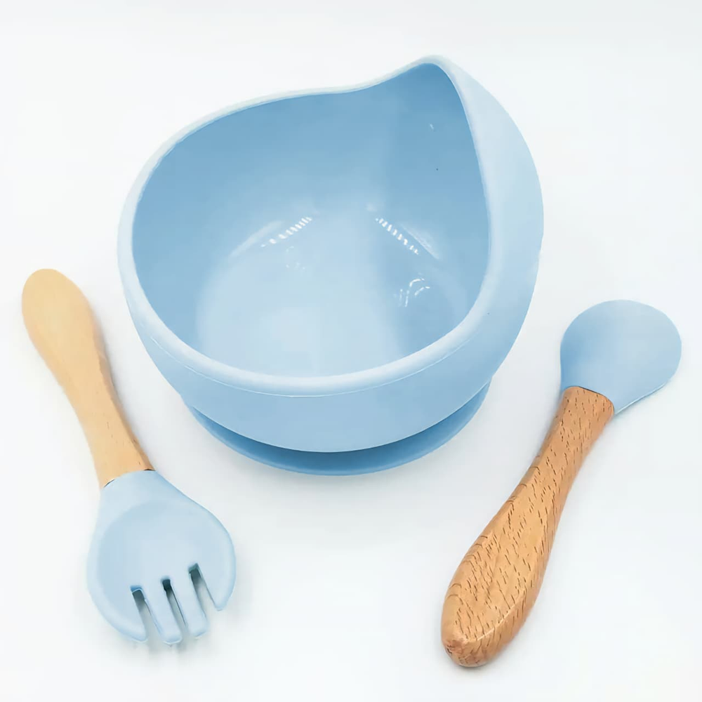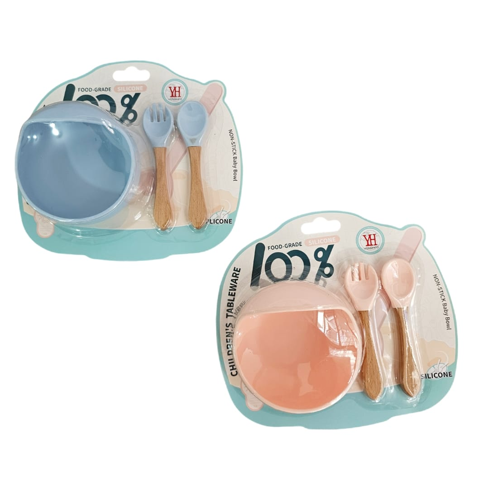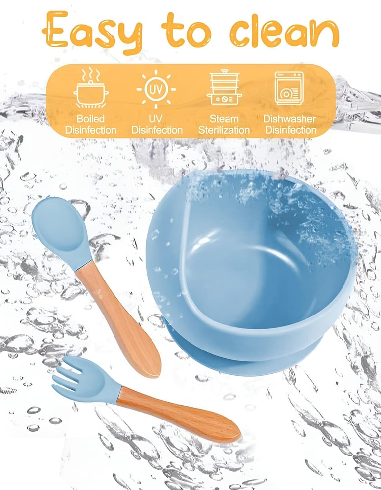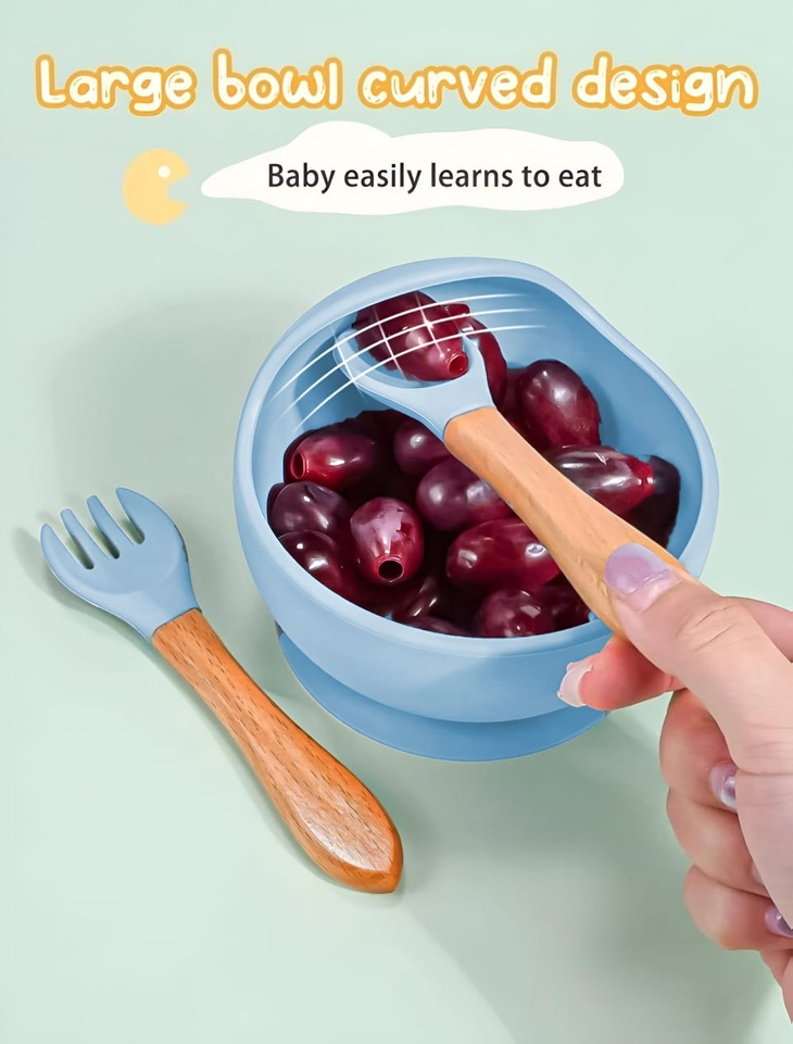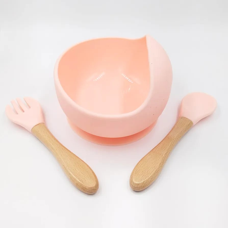 (Set de alimentación de silicona para bebés. Está diseñado para la etapa de alimentación complementaria, generalmente a partir de los 6 meses. Incluye varias piezas, como plato y cubiertos. Es apto para microondas y lavavajillas, y está fabricado con silicona de grado alimenticio, libre de BPA. La silicona lo hace duradero y resistente a caídas, además de fácil de limpiar).