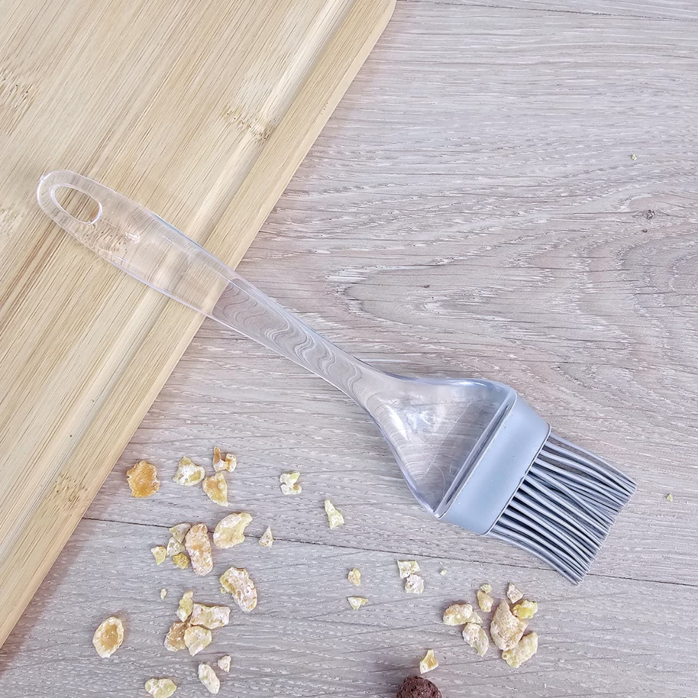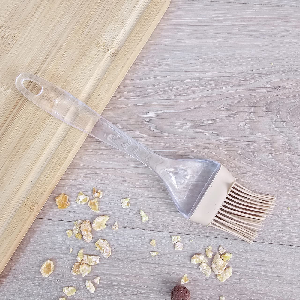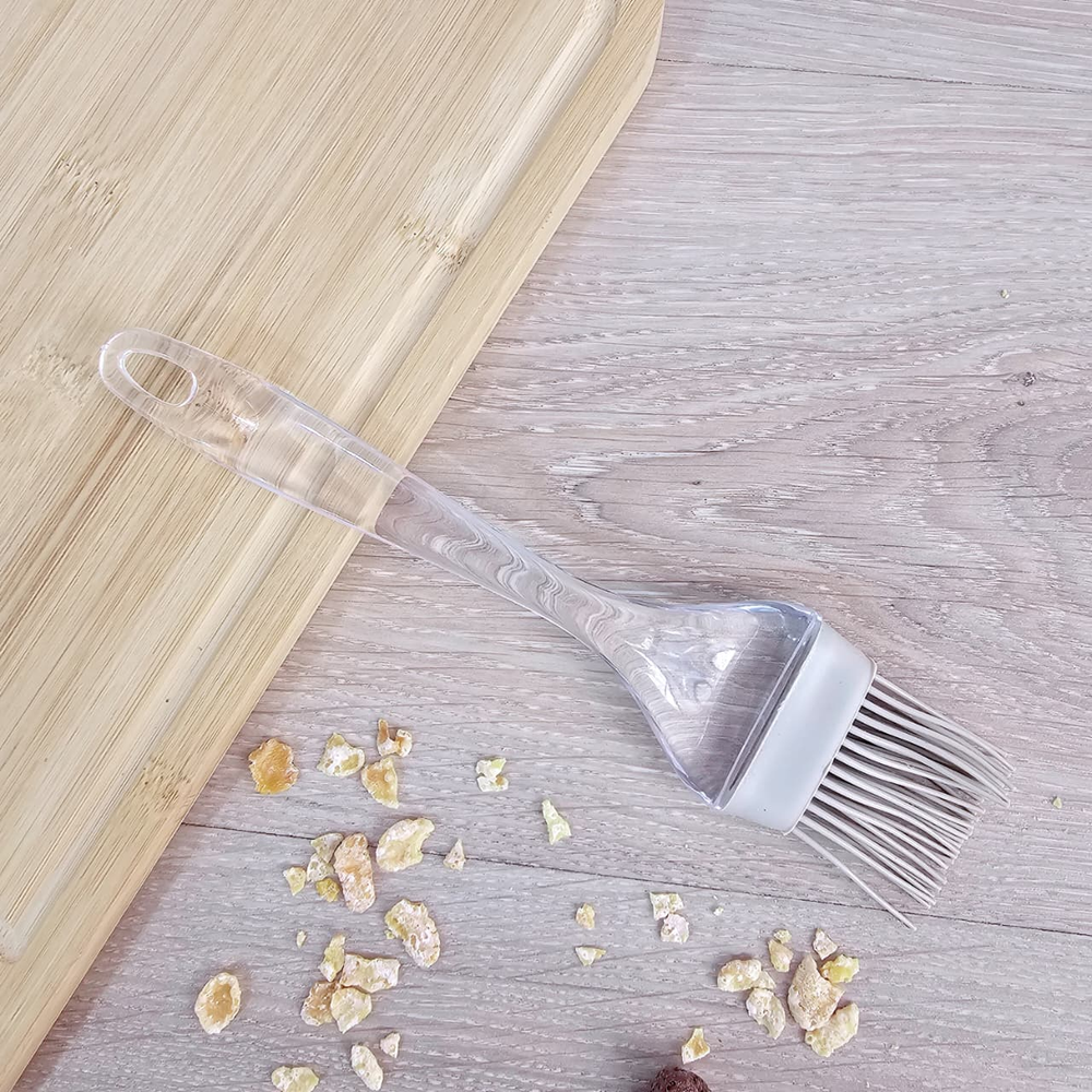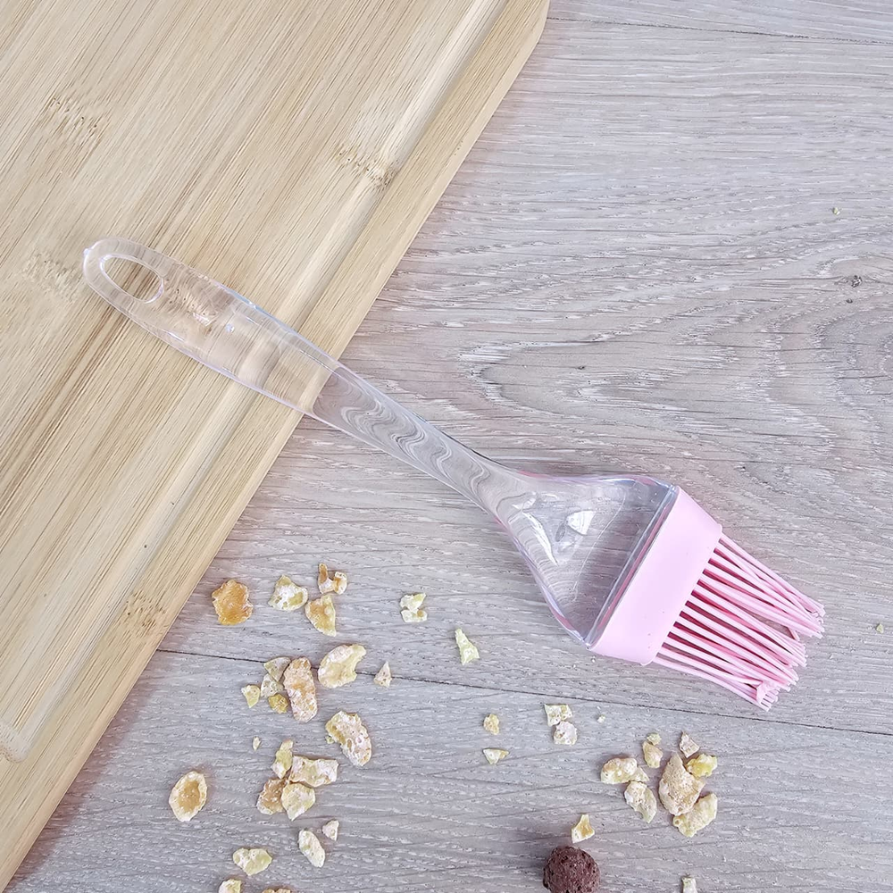 (Pincel de silicona que se utiliza principalmente para aplicar de manera uniforme salsas, glaseados, mantequilla derretida, aceites o marinadas sobre alimentos, tanto en repostería como en la cocina en general. Las cerdas de silicona son resistentes a altas temperaturas y no absorben olores ni sabores, lo que facilita su limpieza y los hace higiénicos. El mango acrílico proporciona un agarre cómodo y seguro para un manejo preciso).