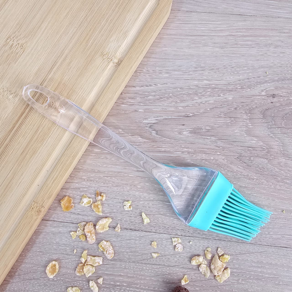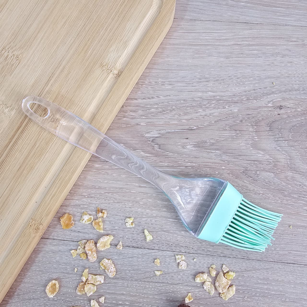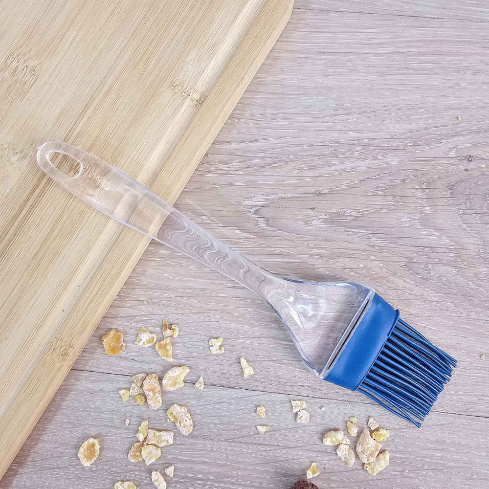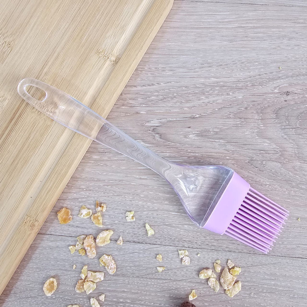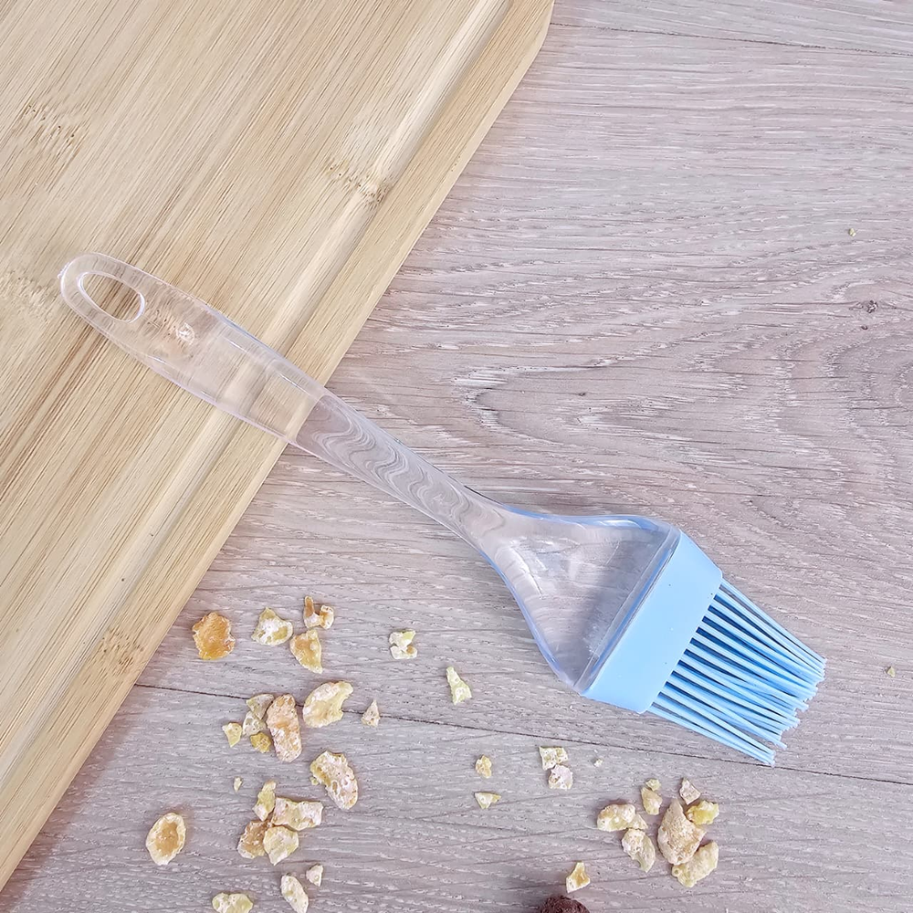 (Pincel de silicona que se utiliza principalmente para aplicar de manera uniforme salsas, glaseados, mantequilla derretida, aceites o marinadas sobre alimentos, tanto en repostería como en la cocina en general. Las cerdas de silicona son resistentes a altas temperaturas y no absorben olores ni sabores, lo que facilita su limpieza y los hace higiénicos. El mango acrílico proporciona un agarre cómodo y seguro para un manejo preciso).