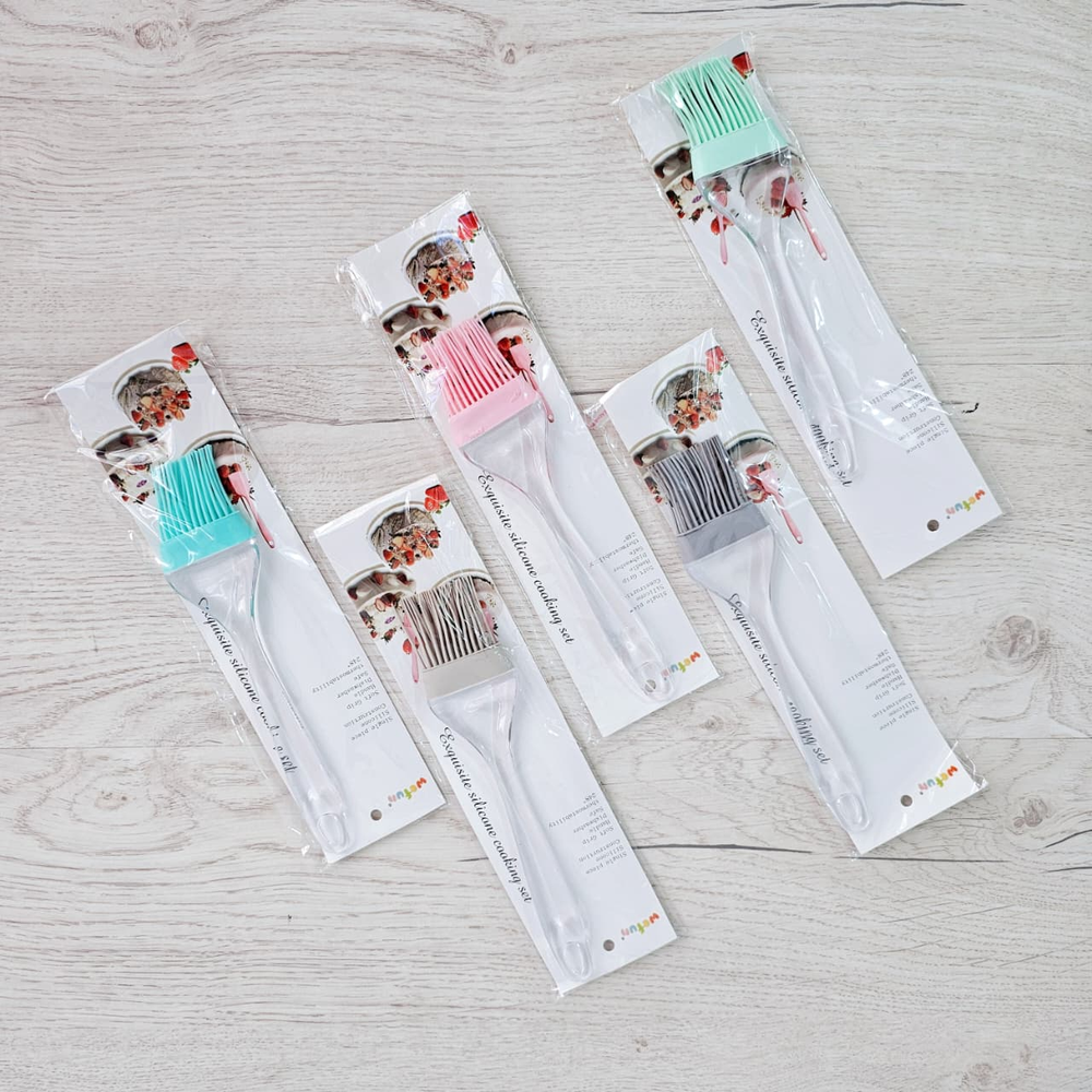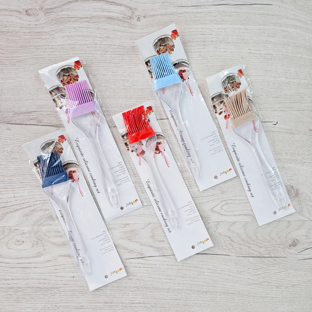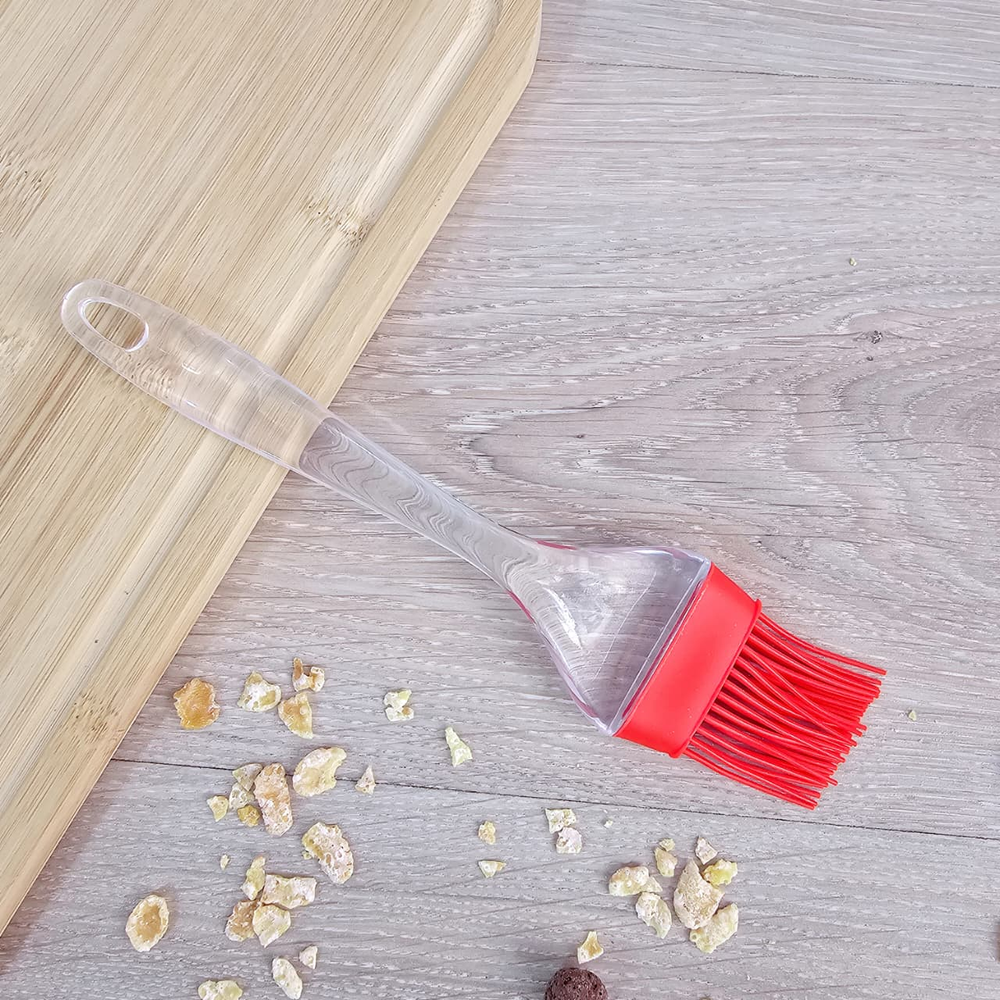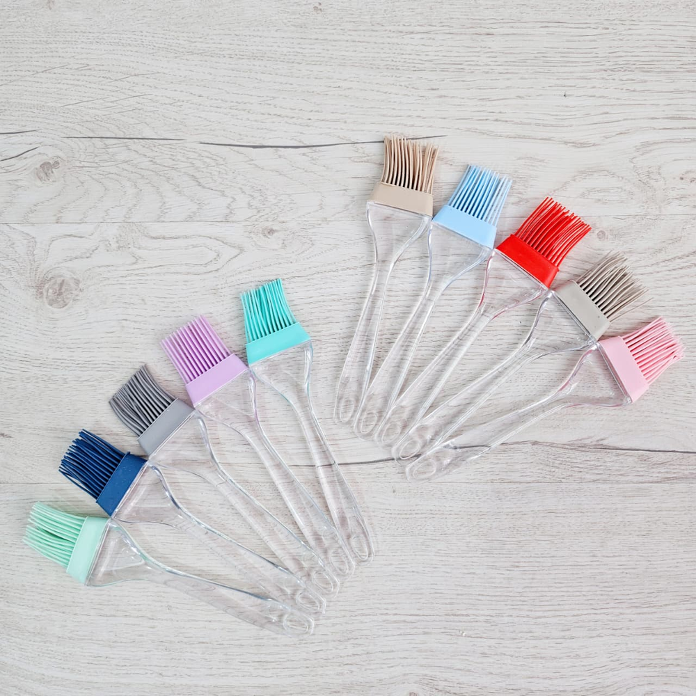 (Pincel de silicona que se utiliza principalmente para aplicar de manera uniforme salsas, glaseados, mantequilla derretida, aceites o marinadas sobre alimentos, tanto en repostería como en la cocina en general. Las cerdas de silicona son resistentes a altas temperaturas y no absorben olores ni sabores, lo que facilita su limpieza y los hace higiénicos. El mango acrílico proporciona un agarre cómodo y seguro para un manejo preciso).