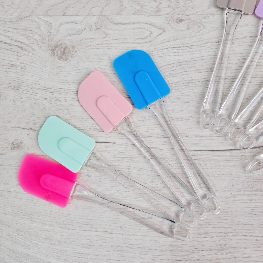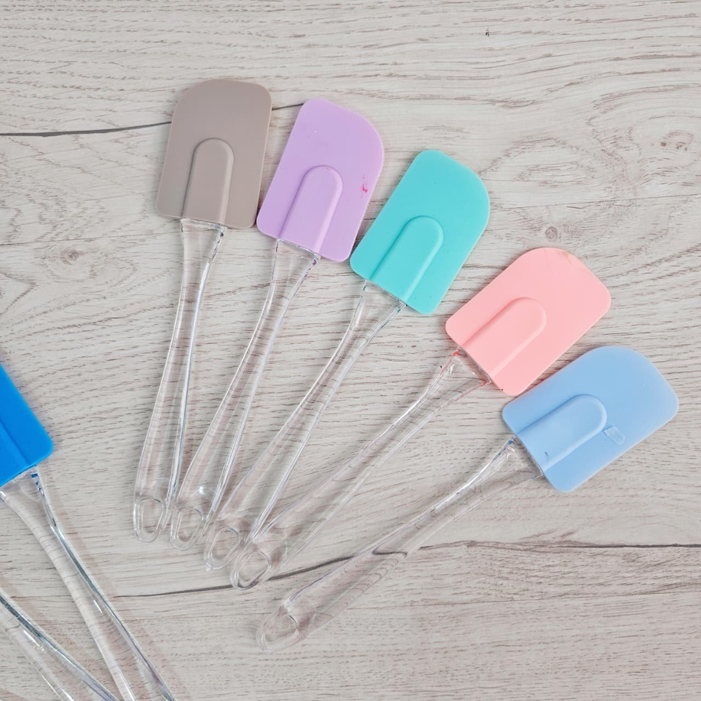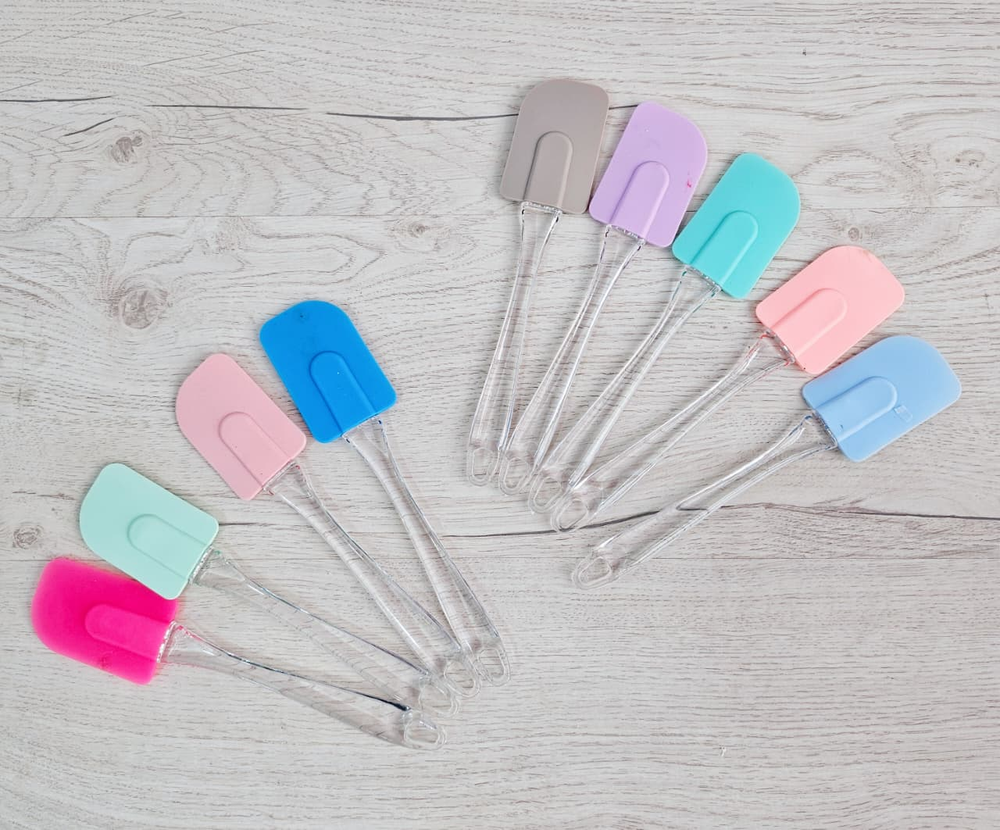(Espátula de silicona con mango acrílico resistente. Ideal para uso en repostería y pastelería. Perfecto a la hora de decorar tortas y postres.Posee un orificio para poder colgar el utensilio).