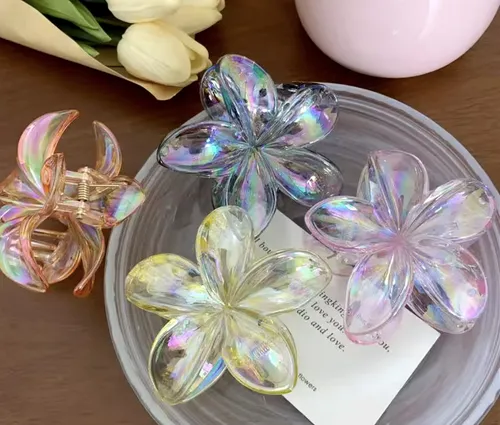 (Pack x 12 hebillas con forma de flor colores tornasolados y transparente tornasolado. Ideal para usar en cualquier evento o simplemente levantar tu look del día).