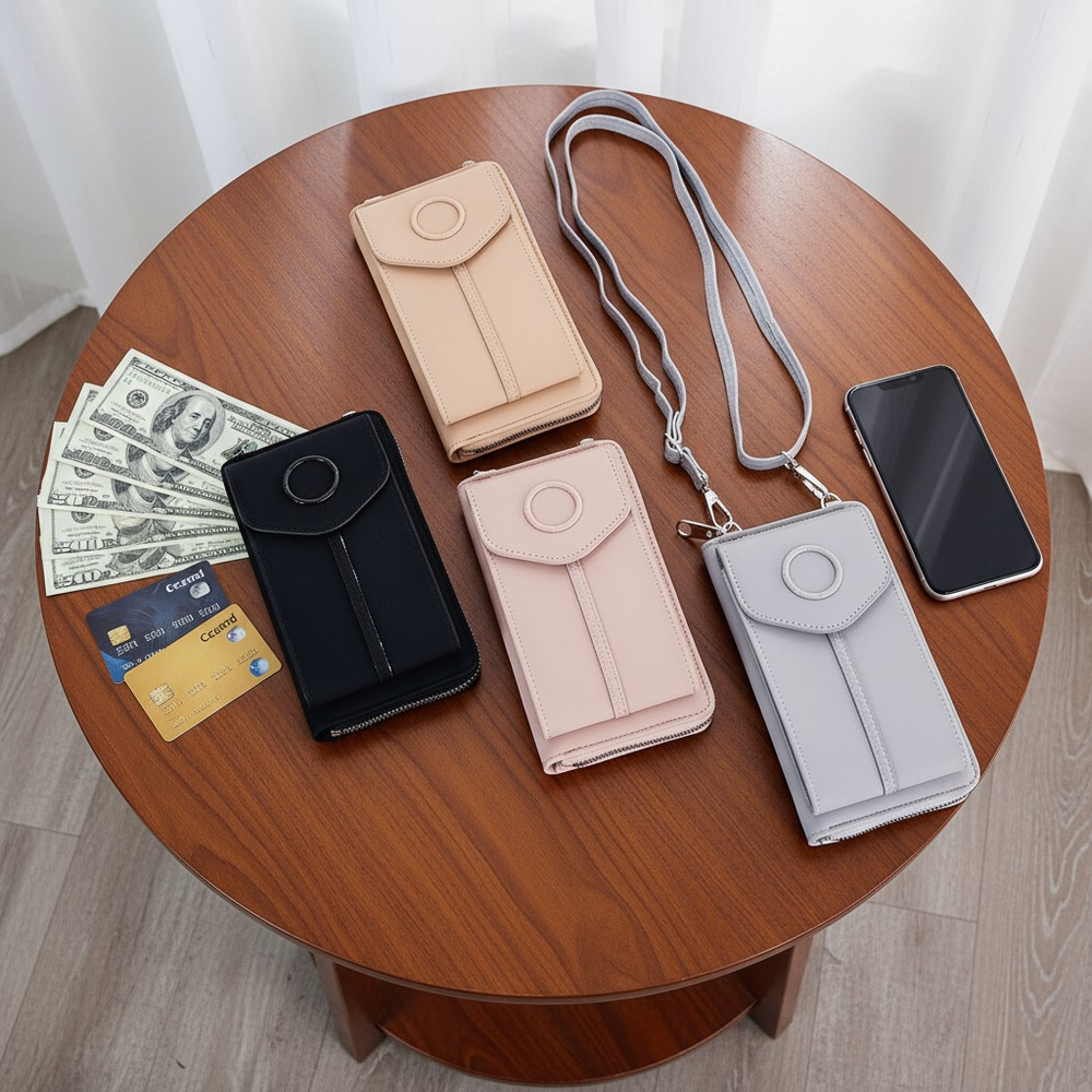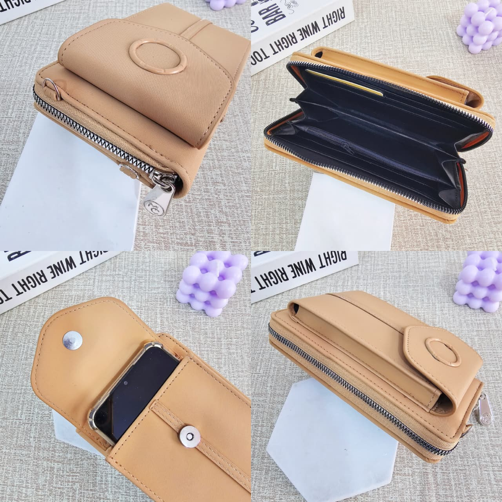 (Billetera Grande lisa que puede usarse también como bandolera ya que incluye una correa para transportarla, en su interior cuenta con 4 compartimentos, uno de ellos con cierre.También incluye en su interior 6 bolsillos chicos para tarjetas o documentos. En la parte delantera tiene un compartimento con cierre donde puede colocarse el celular u otro objeto).