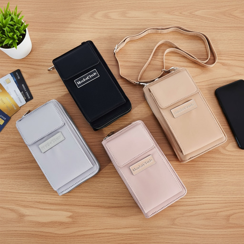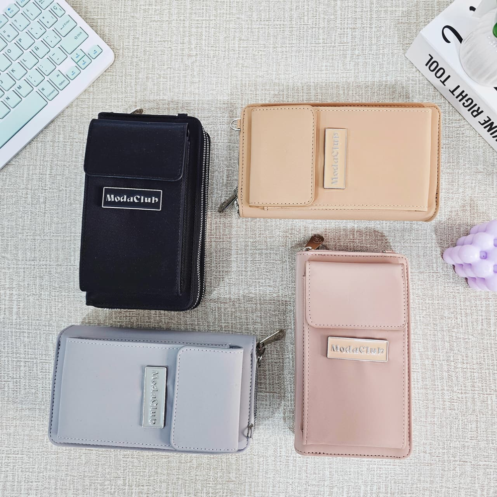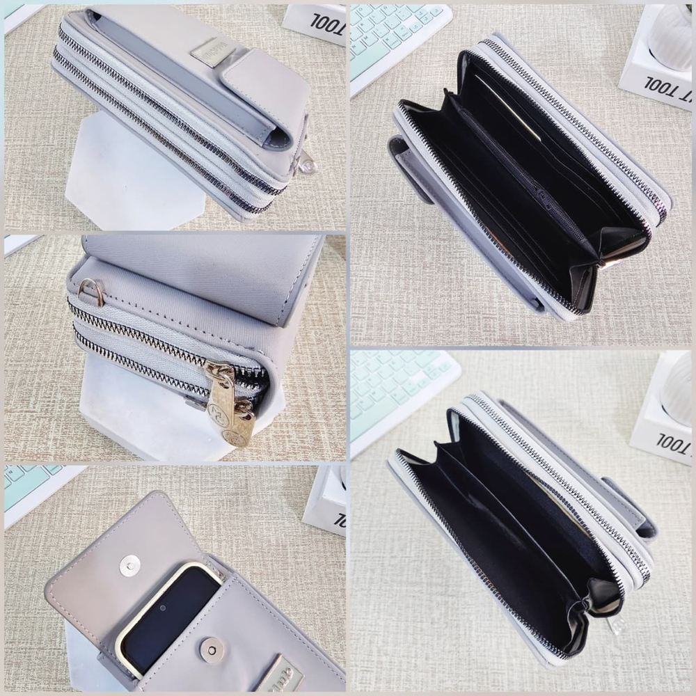 (Billetera Grande lisa que puede usarse también como bandolera ya que incluye una correa para transportarla. El primer cierre cuenta con 4 compartimentos.También incluye en su interior 6 bolsillos chicos para tarjetas o documentos. En el segundo cierre hay dos compartimentos grandes y en la parte delantera tiene un compartimento con cierre donde puede colocarse el celular u otro objeto).