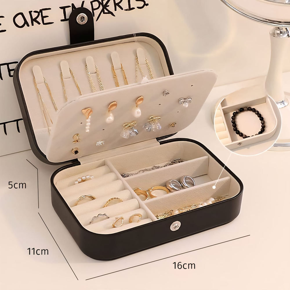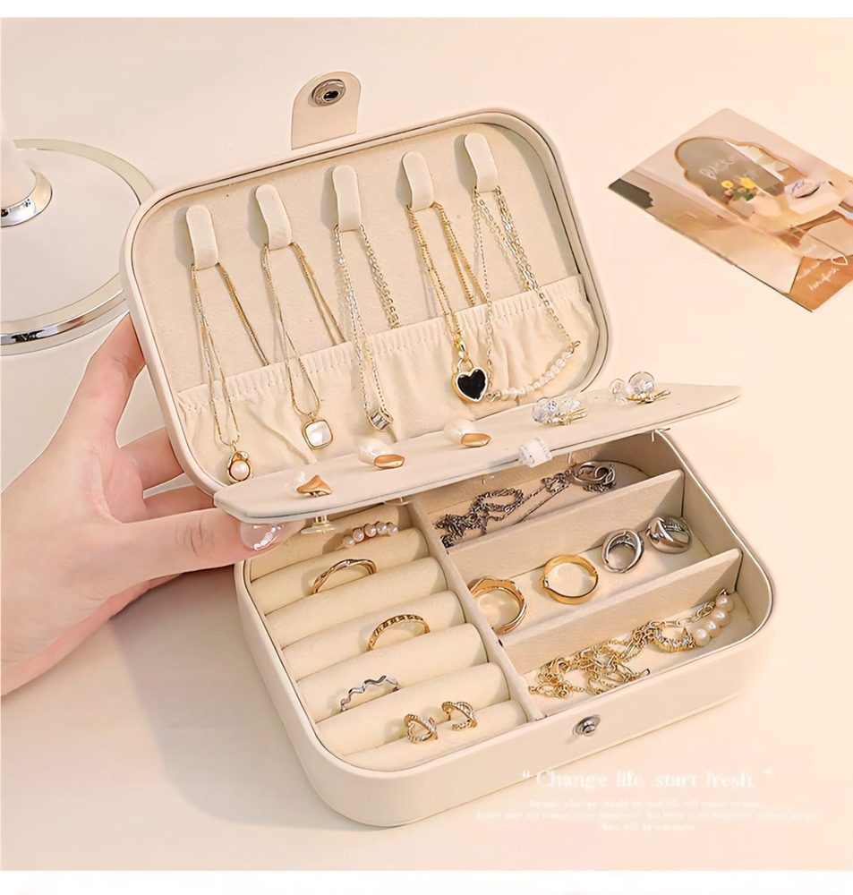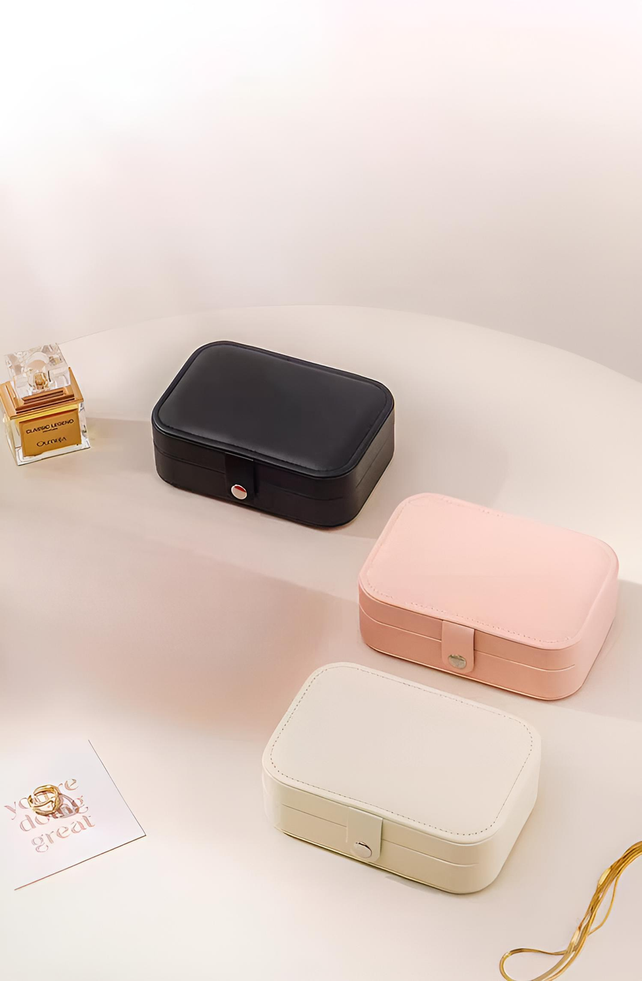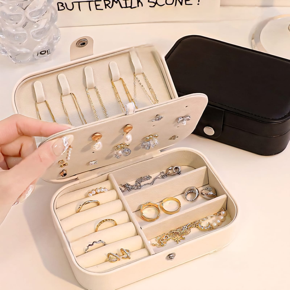 (joyero o alhajero portátil que sirve principalmente para organizar, almacenar y proteger joyas, como anillos, collares, pulseras y aros. Sus compartimentos y ranuras permiten mantener las joyas ordenadas y separadas, evitando enredos y facilitando su búsqueda. El material exterior y el forro interior suave protegen las joyas del polvo, la suciedad, los arañazos y los golpes. Su tamaño compacto y cierre seguro lo hacen ideal para llevar joyas de forma segura durante viajes o para el uso diario). ut24