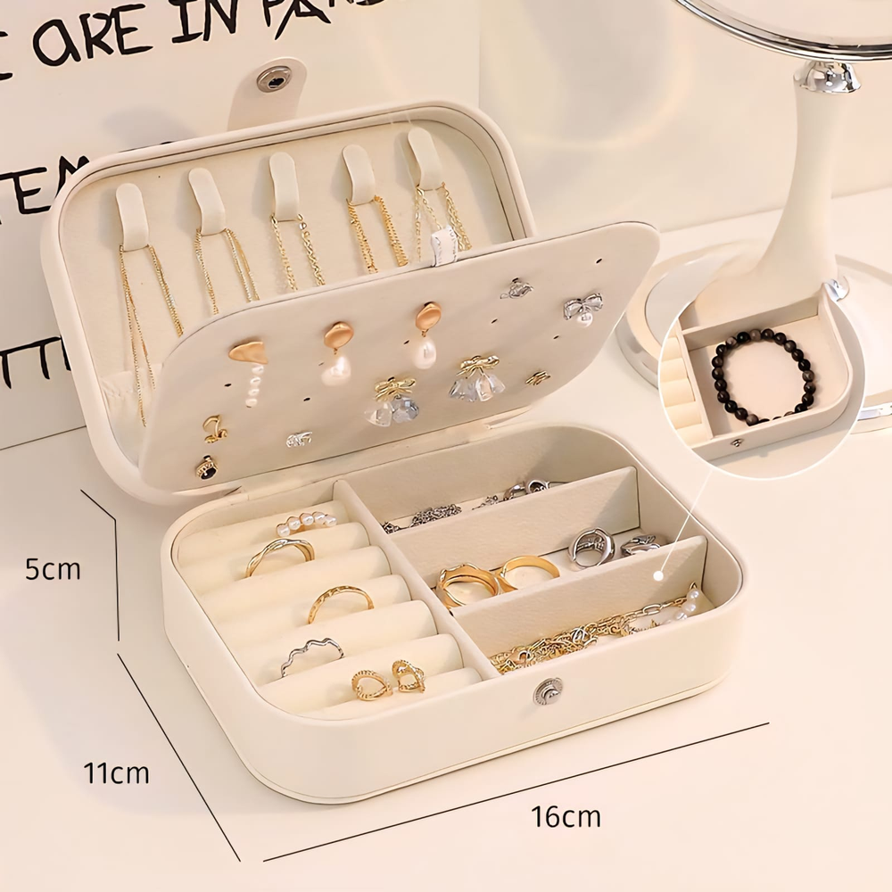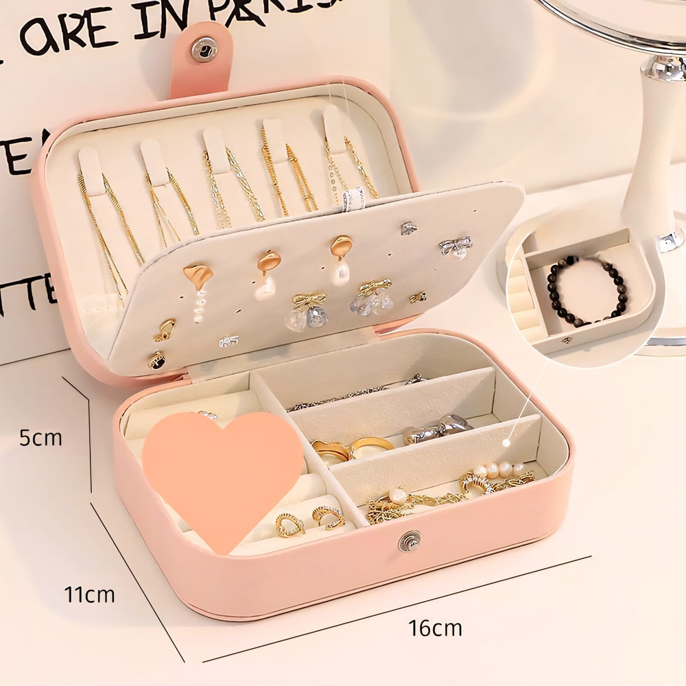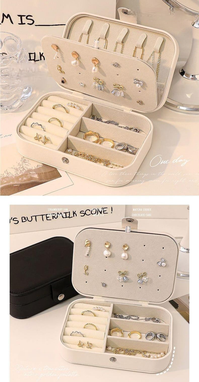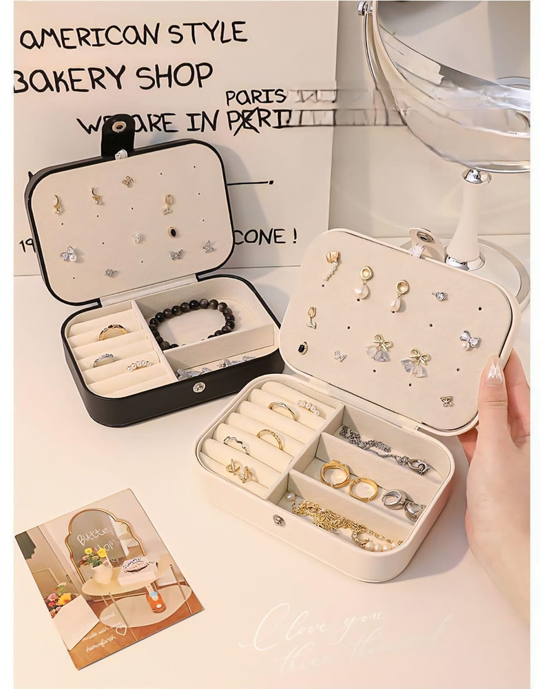 (joyero o alhajero portátil que sirve principalmente para organizar, almacenar y proteger joyas, como anillos, collares, pulseras y aros. Sus compartimentos y ranuras permiten mantener las joyas ordenadas y separadas, evitando enredos y facilitando su búsqueda. El material exterior y el forro interior suave protegen las joyas del polvo, la suciedad, los arañazos y los golpes. Su tamaño compacto y cierre seguro lo hacen ideal para llevar joyas de forma segura durante viajes o para el uso diario). ut24