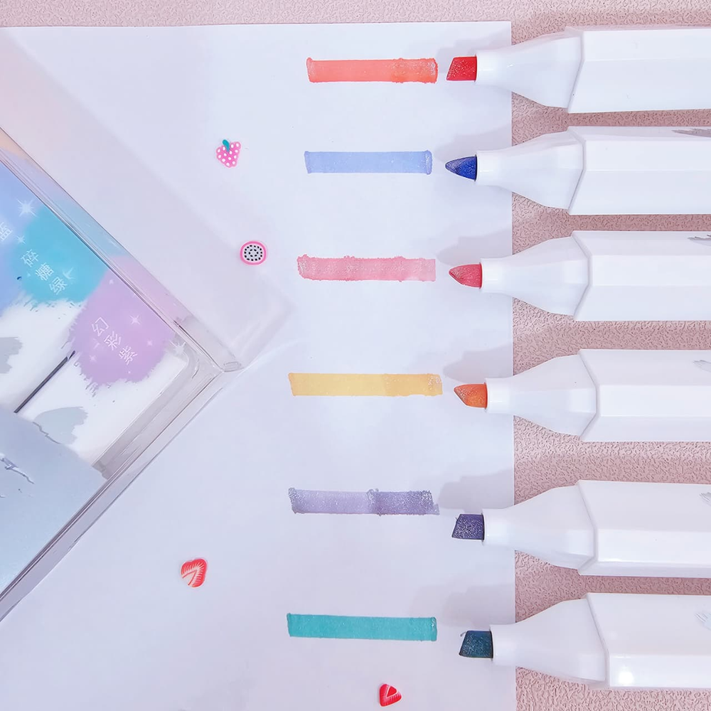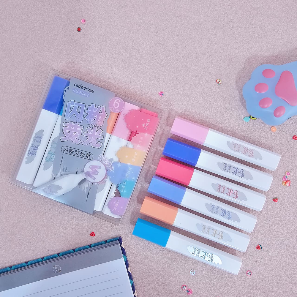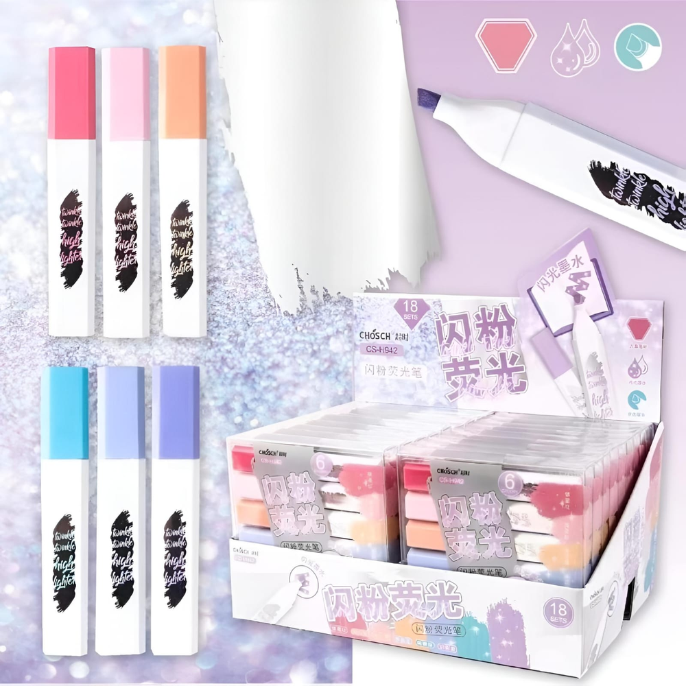 (Set x 6U. Resaltadores con glitter en colores pasteles, punta biseladas. Son ideales para uso escolar y de oficina).