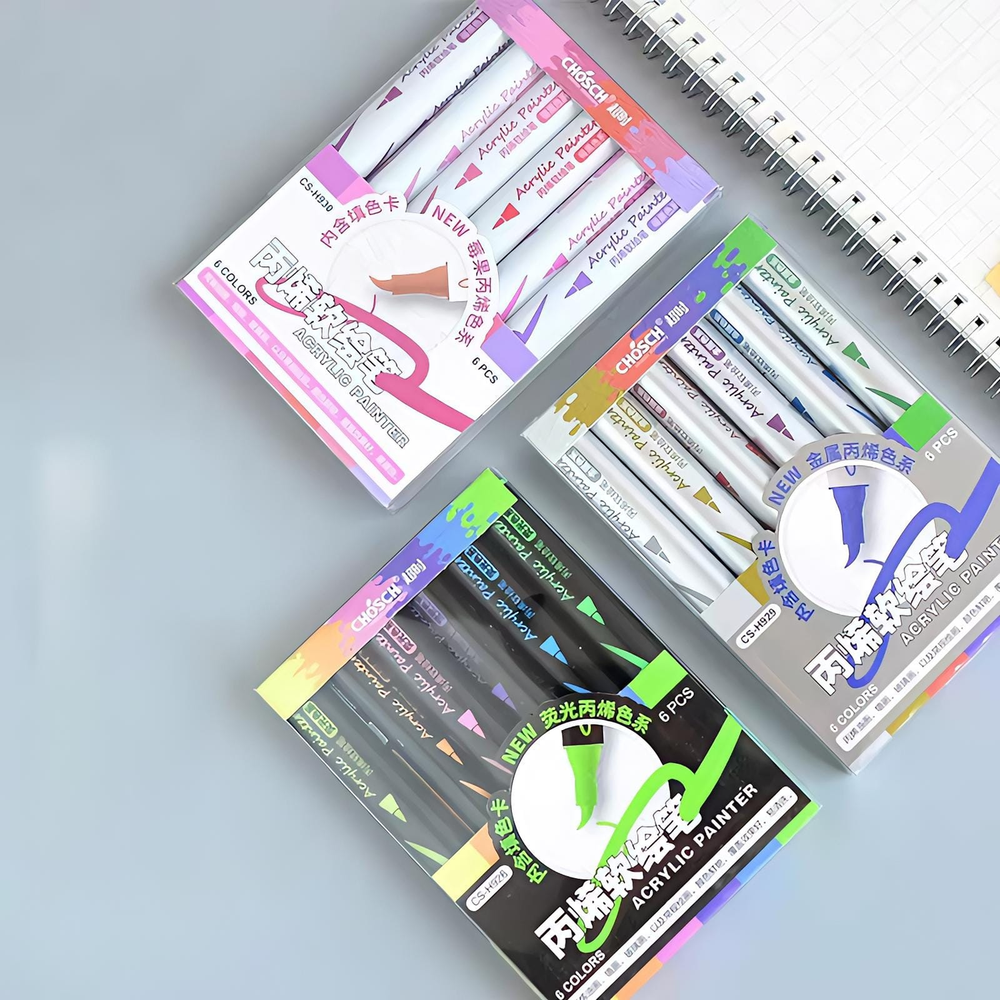 (Caja x 252U. + Exhibidor Marcador marca "CHÓSCH", tinta acrílica ideal para pintar en vidrio, pared o superficie oscuras como cartulina, etc. Punta tipo pincel. Contiene 24 Set x 6 unidades en cajitas y 108 unidades sueltas, 6 de cada color).