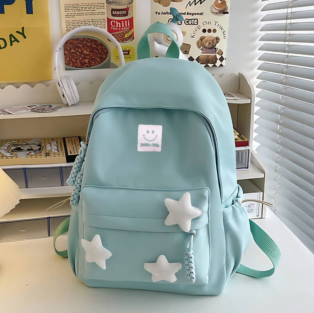 (Mochila escolar o casual, diseñada para llevar libros, útiles escolares, laptops, ropa, botellas de agua y otros objetos personales de forma cómoda y organizada. Dispone de un compartimiento principal con 3 bolsillos internos , 1compartimiento frontal, 2 bolsillos laterales, y un bolsillo trasero. Incluye pins para decorar).