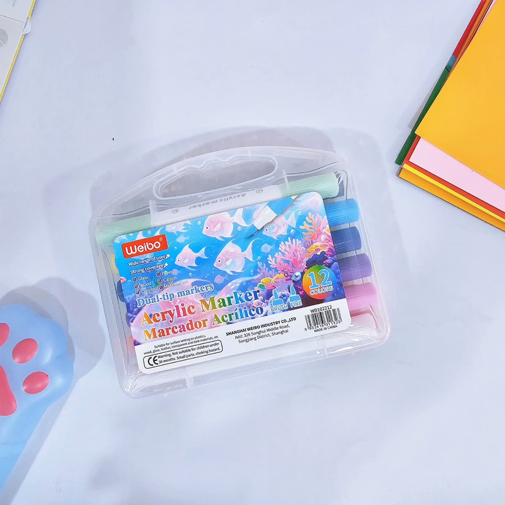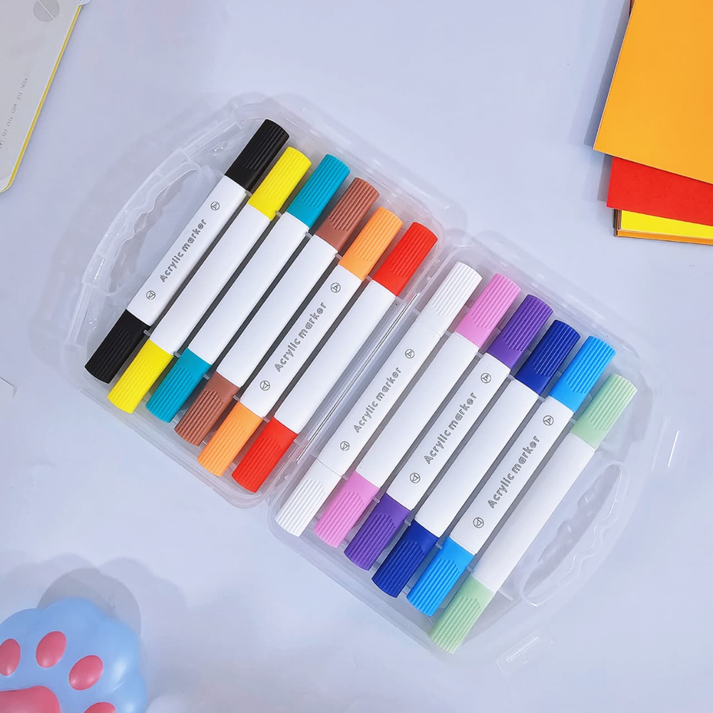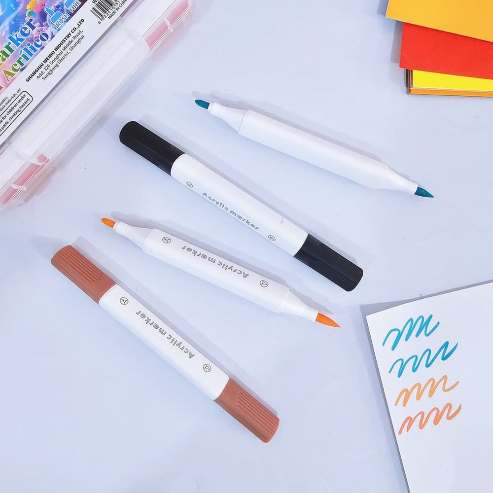 (Estos marcadores contienen pintura acrílica en su interior, lo que les permite pintar sobre casi cualquier superficie, como papel, madera, tela, vidrio y cerámica. tienen doble punta (una fina y una de pincel), lo que los hace versátiles para realizar detalles y rellenar áreas más grandes)