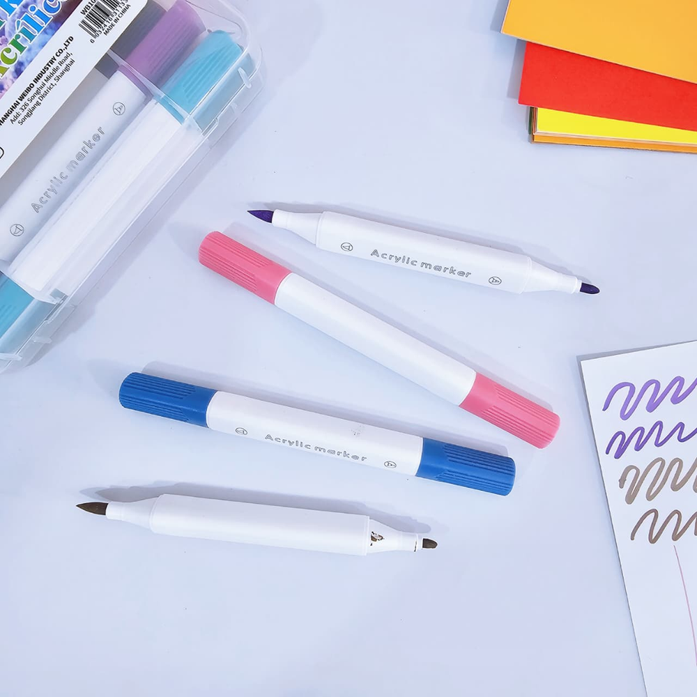 (Estos marcadores contienen pintura acrílica en su interior, lo que les permite pintar sobre casi cualquier superficie, como papel, madera, tela, vidrio y cerámica. tienen doble punta (una fina y una de pincel), lo que los hace versátiles para realizar detalles y rellenar áreas más grandes)