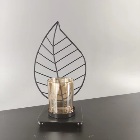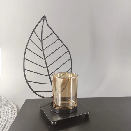 (Porta vela de vidrio alto 4,5cm x diámetro 6cm aprox. Viene con un soporte de metal color negro con una base y de ella sobresale una hoja. No incluye vela.)