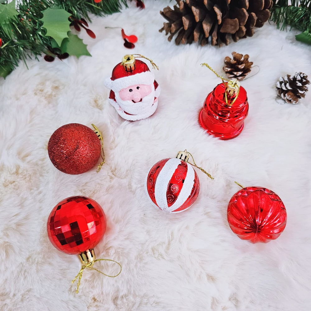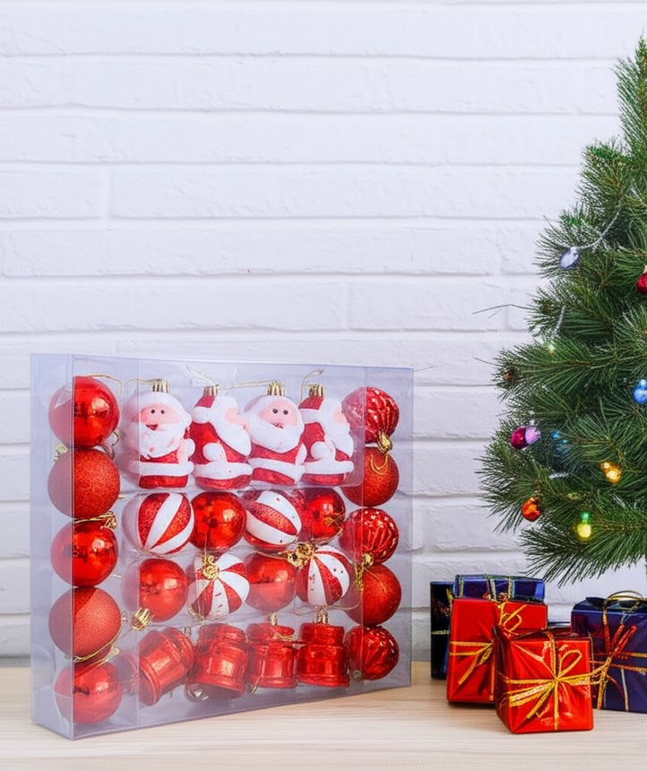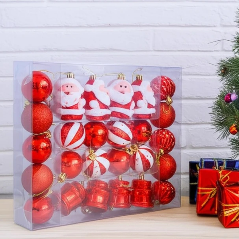 (Cada caja cuenta con 26 Pcs. de adornos navideños como papa noel, campanas y bolas, corazones y estrellas para decorar el árbol de navidad).