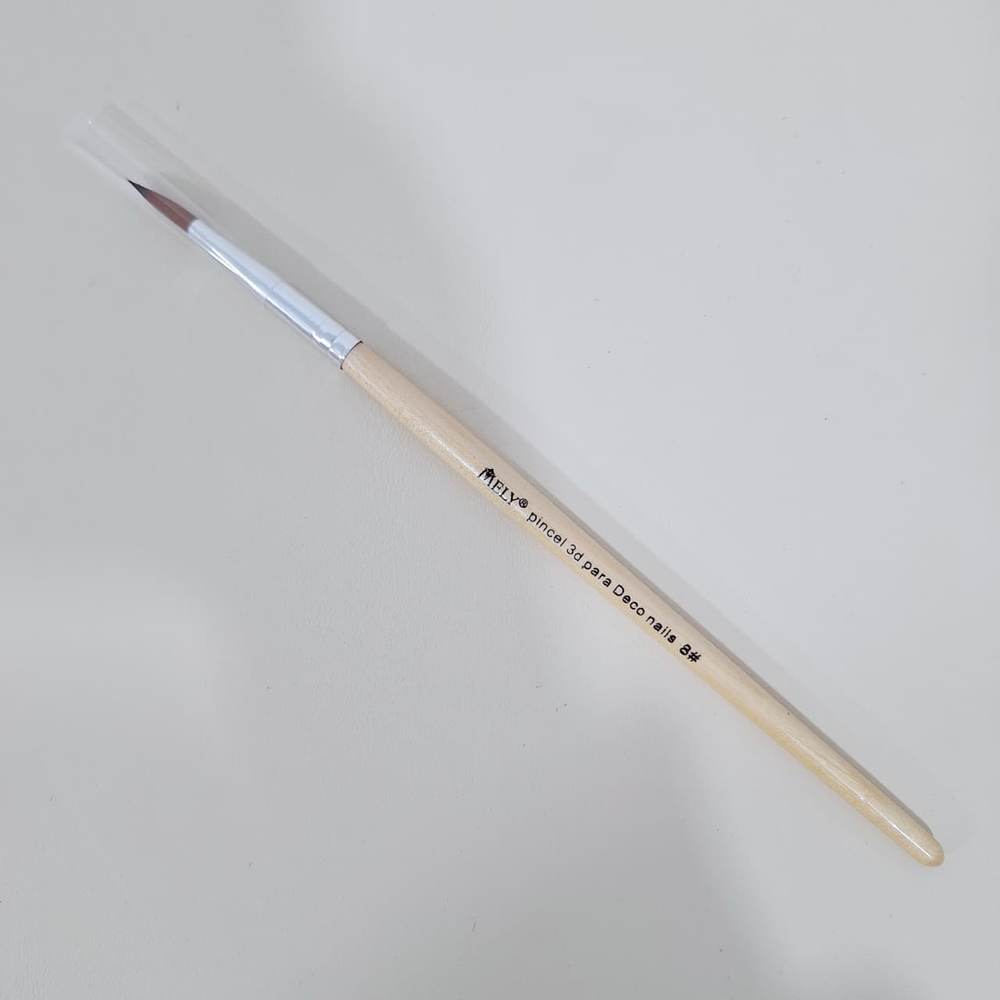 Pincel de manicura 3D de la marca MELY, número 8. Este tipo de pincel se utiliza para crear diseños con relieve en las uñas. Es ideal para moldear diseños tridimensionales con acrílico. El tamaño #8 es adecuado para la aplicación general de acrílico y para cubrir áreas más amplias de la uña de manera rápida y eficiente. El pincel tiene un mango de madera y una punta que permite una distribución precisa y controlada del material, lo que lo hace una herramienta útil para manicuras profesionales.